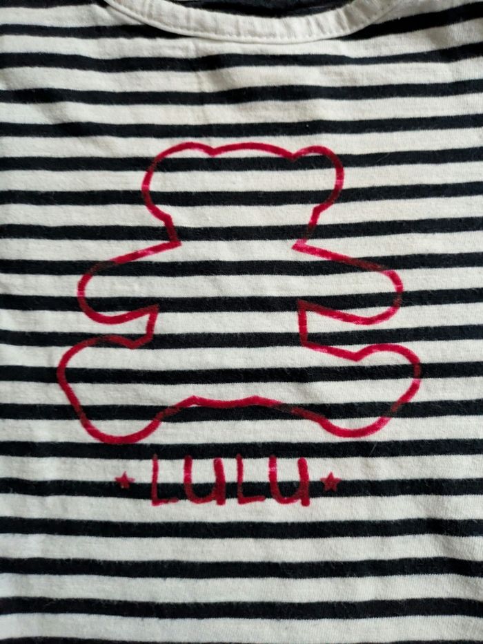 Haut manches longues fille avec ours lulu sur le devant style marinière à lignes Marque lulu castagnette Taille 4 ans Bien porté, micro trou à la manche. Voir photos.