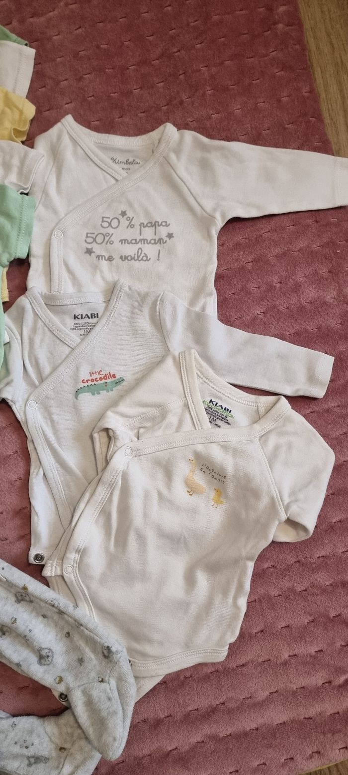 -2 pyjamas (Kimbaloo et InExtenso), très pratique avec ouverture sur le devans -2 gilets tricots (le bleu Orchestra et le blanc fait main), très bien pour la maternité -5 bodys manches courtes Kiabi -3 bodys manches longues avec ouverture pratique (Kiabi et Kimbaloo) Tout est en excellent etat car très peu (voire pas du tout) porté