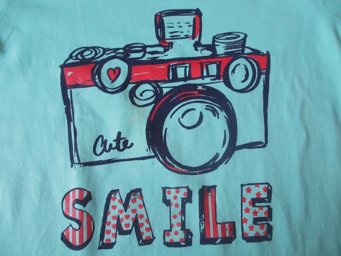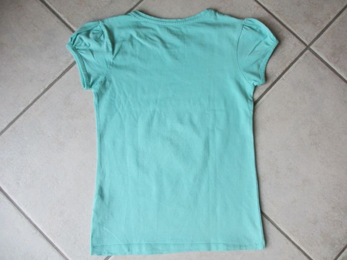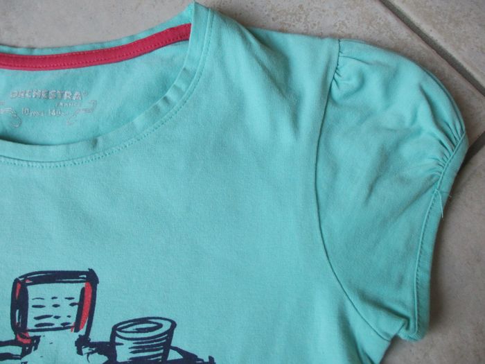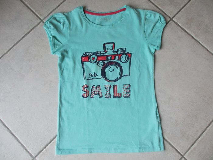 T-shirt manches courtes fille Orchestra - 10 ans Vert avec motif appareil photo. Bon état (l’ourlet sur le bas du t-shirt est décousu à 2 endroits).