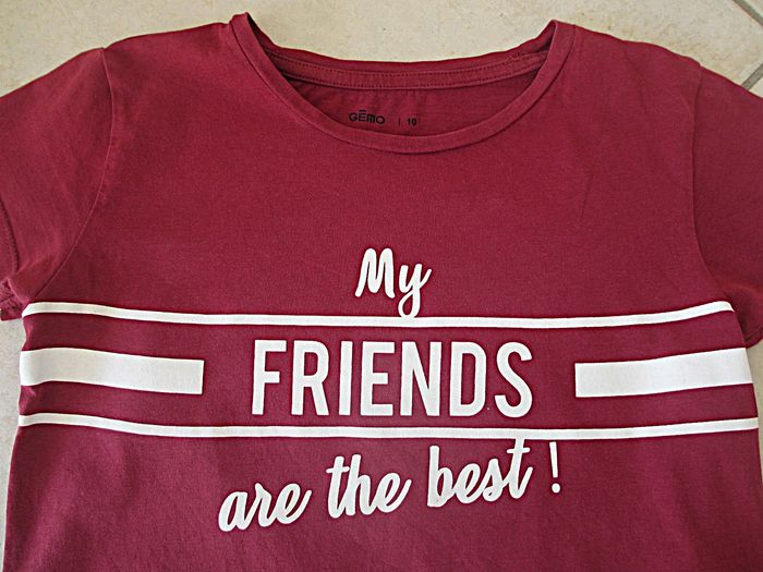 T-shirt manches courtes bordeaux fille Gémo - 10 ans Motif blanc « My friends are the best ». Très bon état.