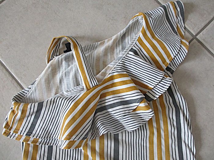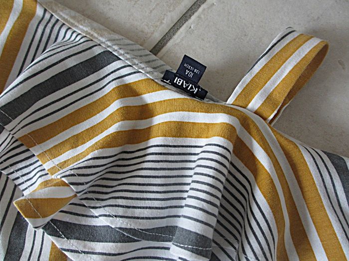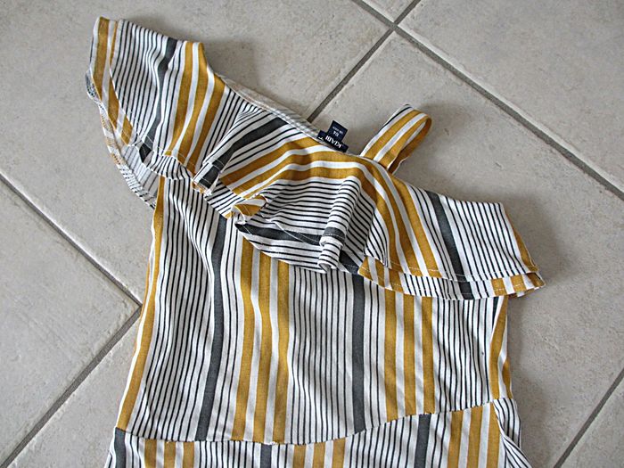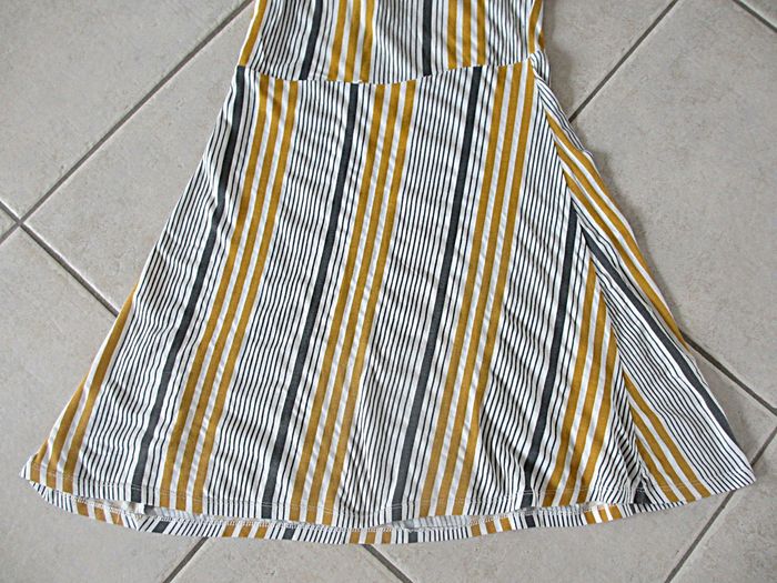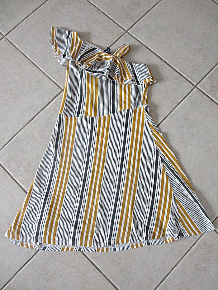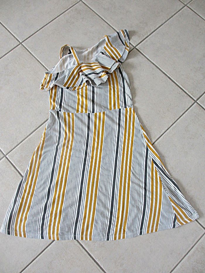 Robe été fille Kiabi - 10 ans Rayures blanches, grises et moutarde. Haut asymétrique. 96 % coton, 4 % élasthanne. Très bon état.