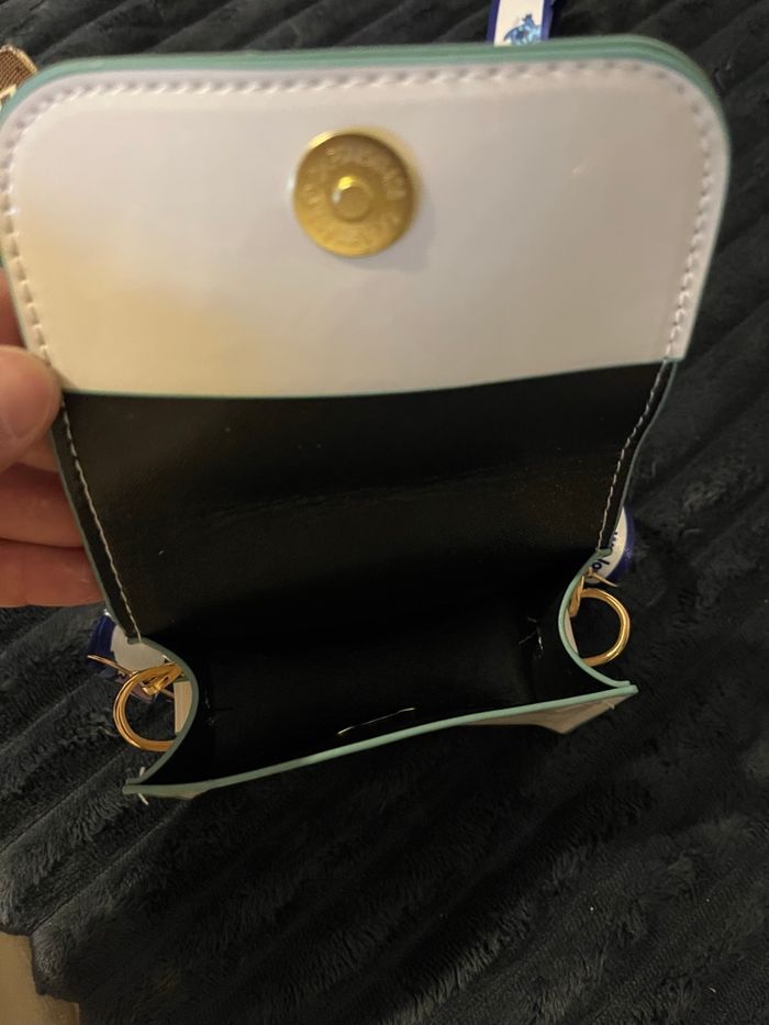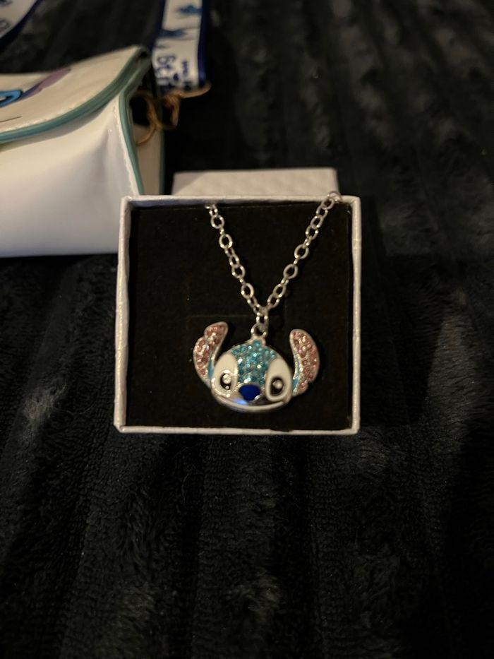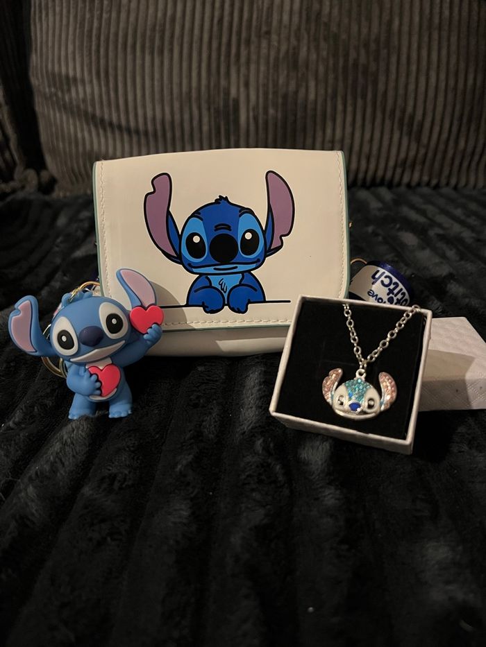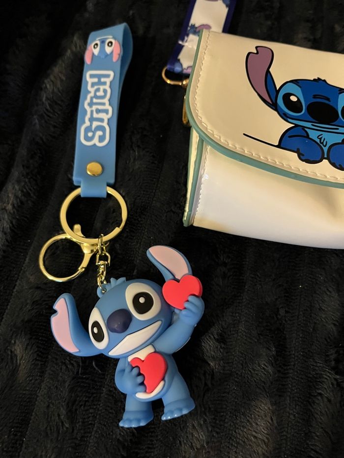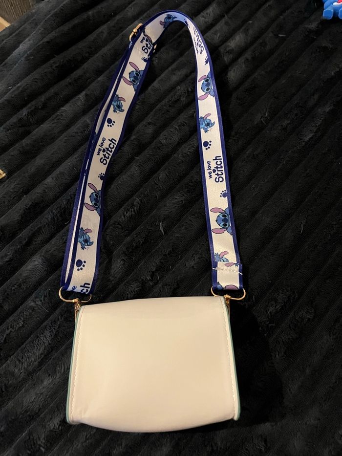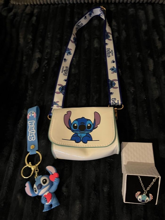 Vends sac bandoulière stitch de couleur blanc Dimension 11.5cm longueur 10 cm de hauteur 5 cm de profondeur 1porte clés bleu stitch 1 collier stitch avec sa boîte blanche