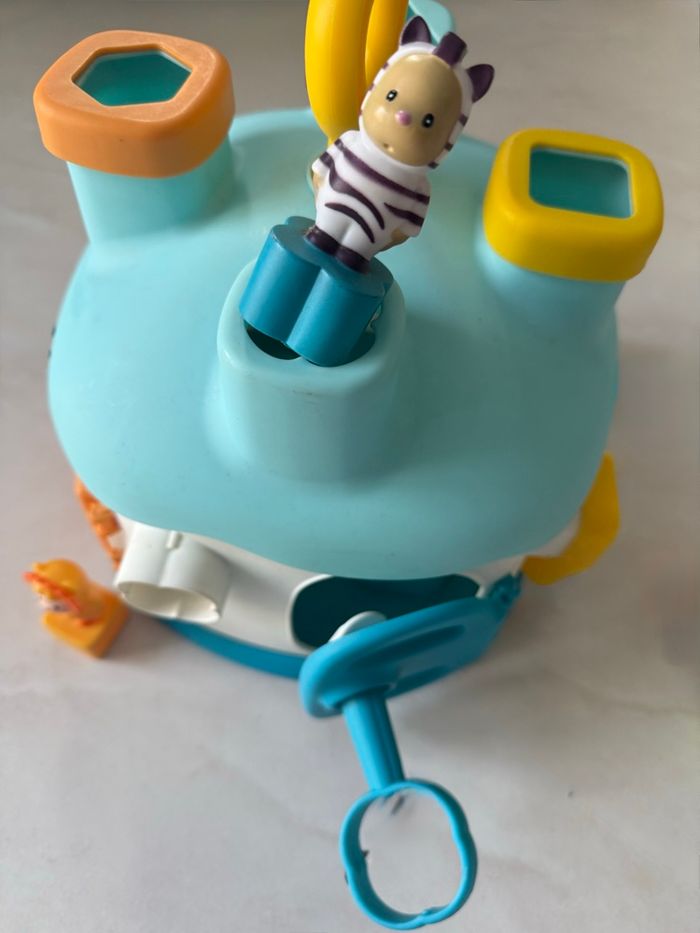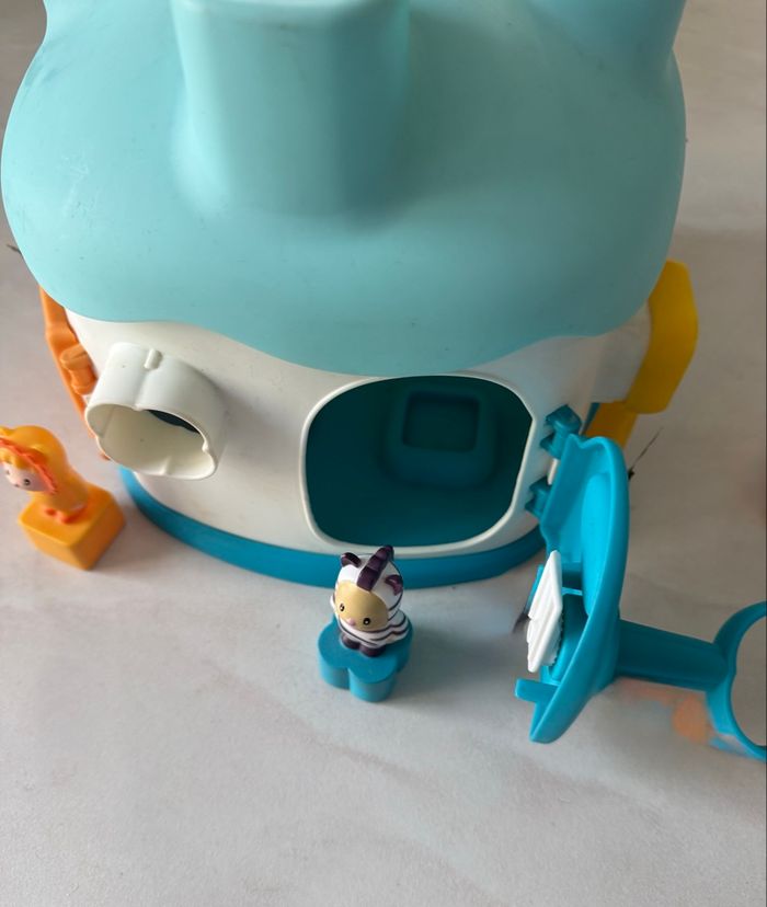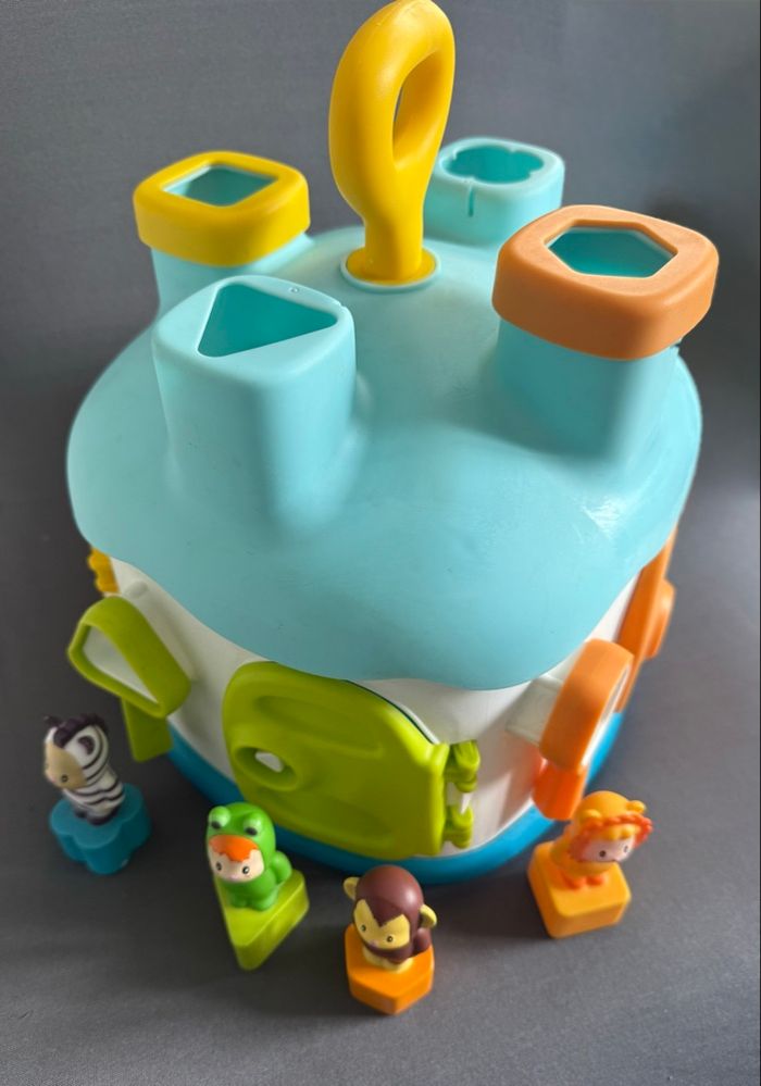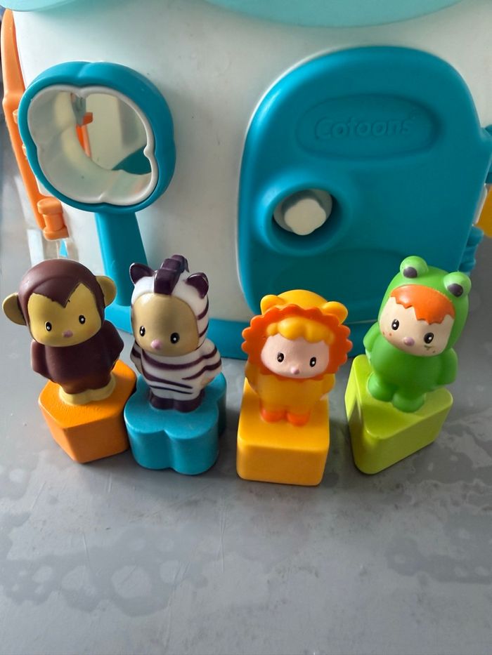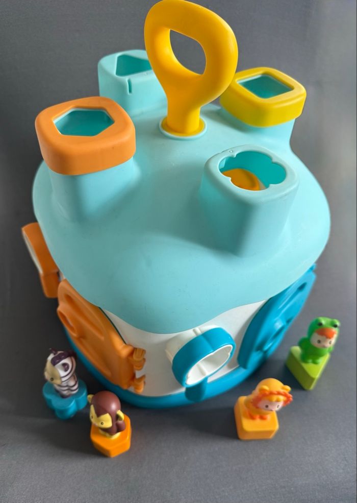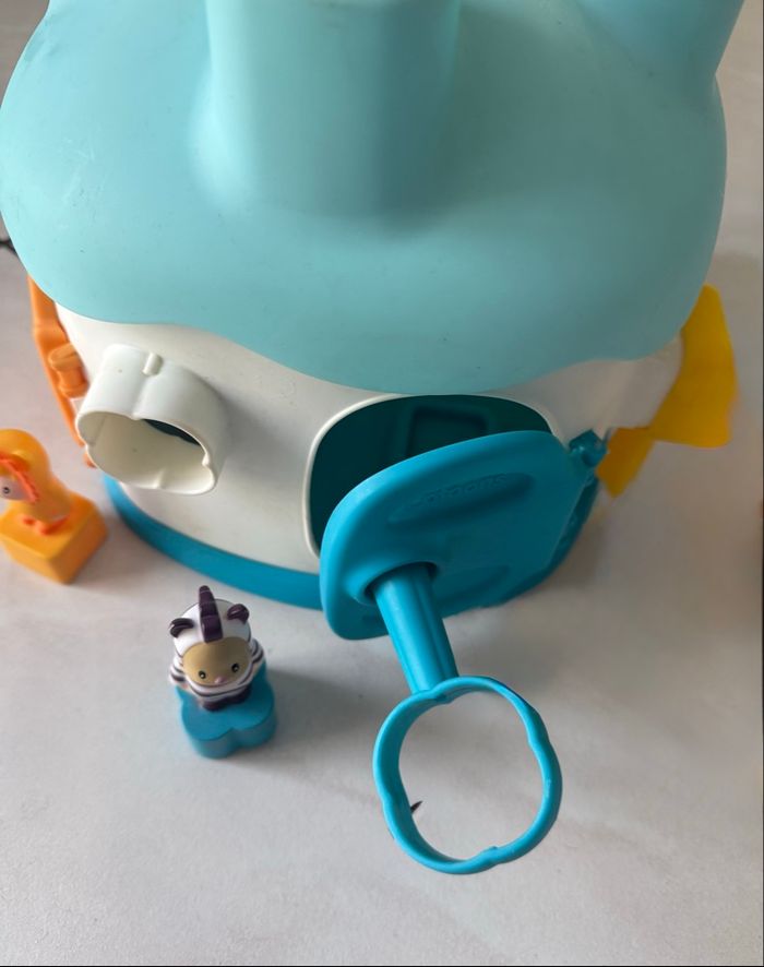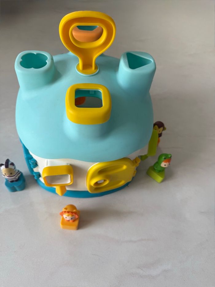 Maison des Formes Cotoons de Smoby bleu La maison des Cotoons est pleine de surprises... L'enfant pourra apprendre à reconnaître les formes, ouvrir les portes avec les bonnes clés de couleur verte, jaune, orange et bleue au nombre de 4, et apprendre les couleurs. Avec 4 personnages Cotoons avec des formes qui sont à insérer dans les trous des différentes formes sur le dessus (manque juste le bleu et vert) mais ne gêne en rien pour insérer les personnages. Ce qui permet de développer l'imagination des petits. Tous les accessoires se rangent dans la maison. Poignée pour transporter facilement la maison A partir de 12 mois Très bon état (usure normale du jeu)