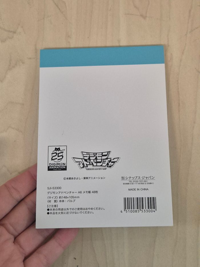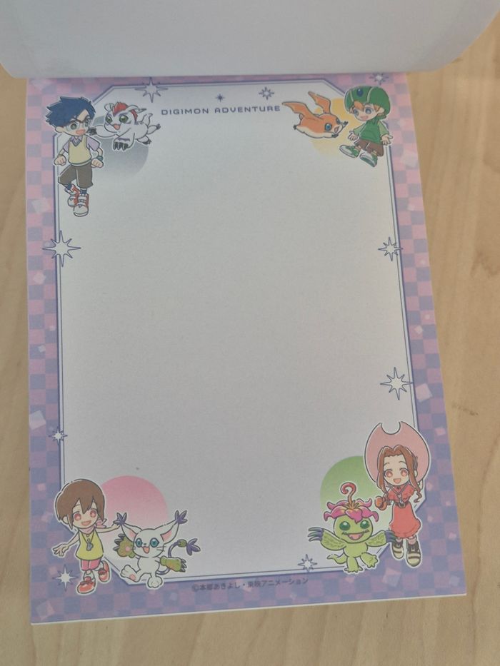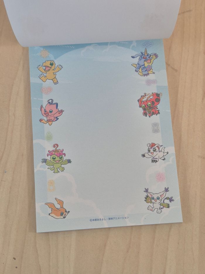Bloc memo Digimon ver. Bleue. Papier, environ 15 x 10 cm. 3 designs de feuilles. En parfait état (jamais utilisé). Dernier exemplaire. 🌸Les prix sont fixes, car ils intègrent les taxes auxquels les pros sont asujettis. Aucune offre ne sera acceptée qu'il s'agisse d'un lot ou d'un article à l'unité, merci. 🌸N'hésitez pas à vérifier la disponibilité de l'article avant de procéder à l'achat.