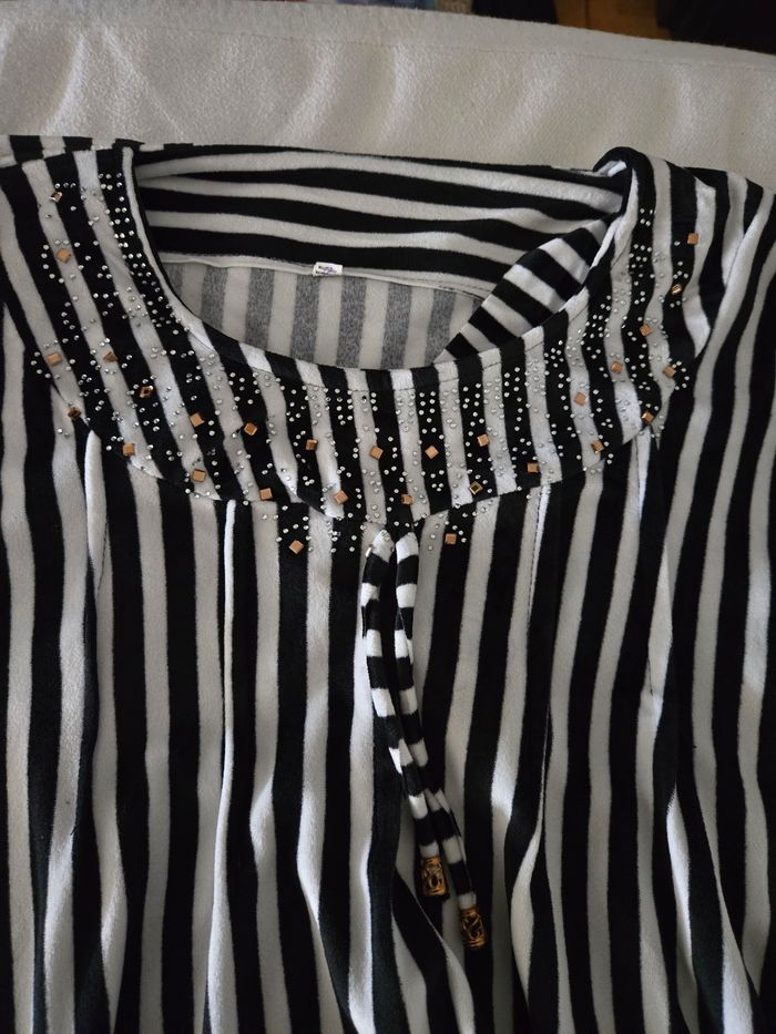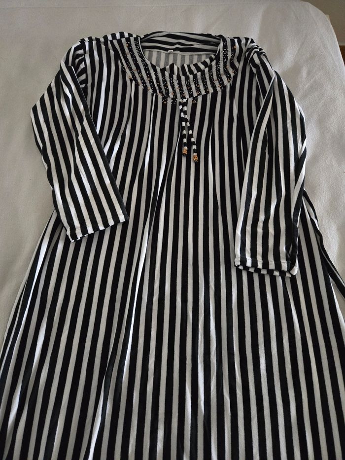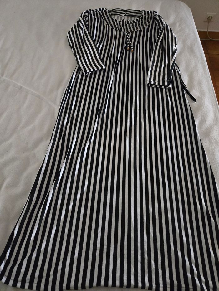 Je vends cette robe kabyle en taille unique, avec un motif de rayures noir et blanc. - Type de produit : Robe - Taille : Taille unique - Couleur : Noir et blanc - Caractéristiques : Rayures verticales, Col rond N'hésitez pas à me contacter pour plus d'informations ou de photos.