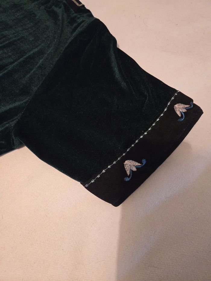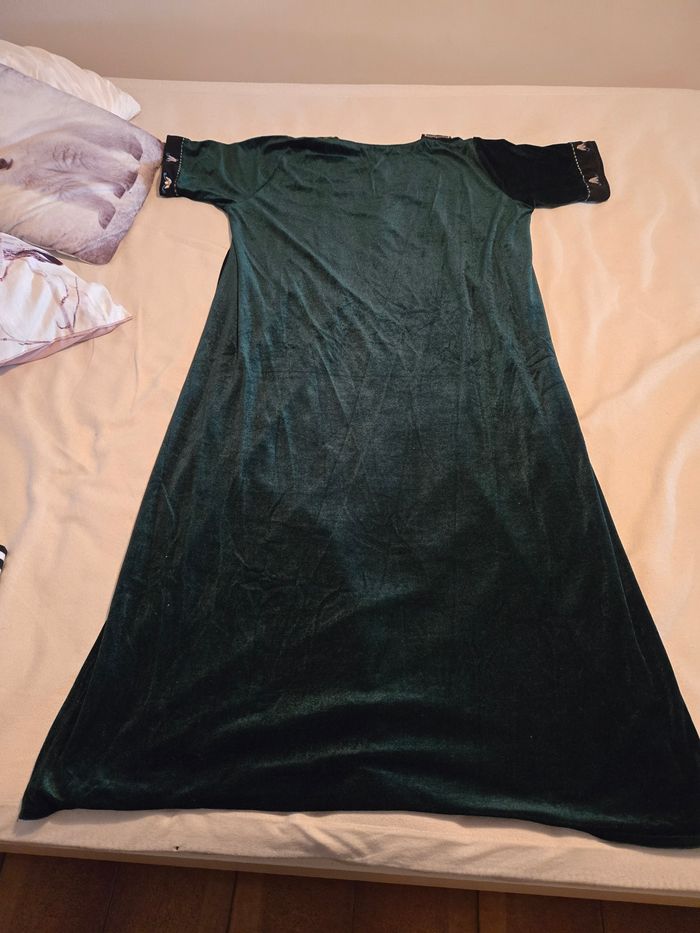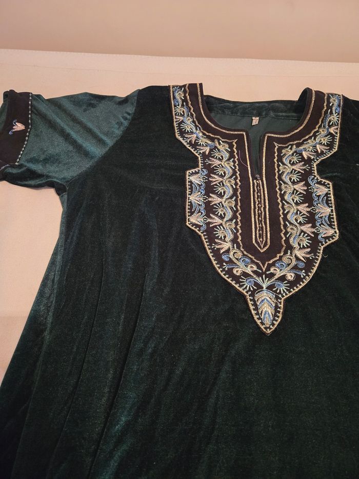 Je vends cette robe kabyle en velours vert foncé avec des broderies dorées. - Type de produit : Robe - Taille : Taille unique - Couleur : Vert foncé - Matière : Velours - Caractéristiques : Broderies dorées sur le devant N'hésitez pas à me contacter pour plus d'informations ou de photos.