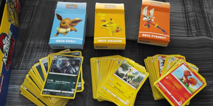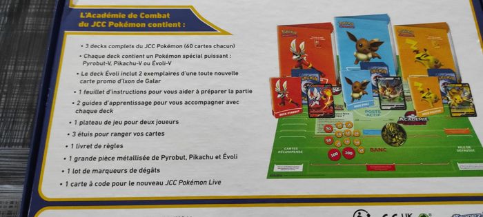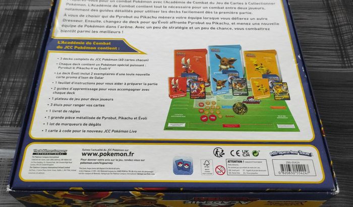 Préparez-vous pour un combat Pokémon avec l'Académie de combat de jeu de cartes à collectionner Pokémon. l'Académie de combat contient tout le nécessaire pour un combat entre deux joueurs notamment des guides détaillés pour utiliser les deck facilement dès la première partie point à vous de choisir qui de Pyrobut ou Pikachu mènera votre équipe lorsque vous défierez un autre dresseur. Ensuite, changer de deck pour qu'Evoli affronte Pyrobut ou Pikachu, et mener une nouvelle équipe de Pokémon dans l'arène. Avec un peu de stratégie et un peu de chance, vous combattrez bientôt parmi les meilleurs ! l'Académie de combat du JCC Pokémon contient : trois deck complet du JCC Pokémon soit 60 cartes chacun. Chaque deck contient un Pokémon spécial puissant : Pyrobut-V, Pikachu-V ou Evoli-V. _ Le deck Evoli inclus deux exemplaires d'une toute nouvelle carte promo Dixon de galar un feuillet d'instruction pour vous aider à préparer la partie _ 2 guides d'apprentissage pour vous accompagner avec chaque deck un plateau de jeu pour deux joueurs _ 3 étui pour ranger vos cartes, un livre de règles, une grande pièce métallisée de pyrobute Pikachu et Evoli, un lot de marqueur de dégâts, une carte à code pour le JCC Pokémon live Servi 1 fois. Il est complet et en très bon état, il y a juste un léger accroc sur le bord de la boite, vu à l'image.