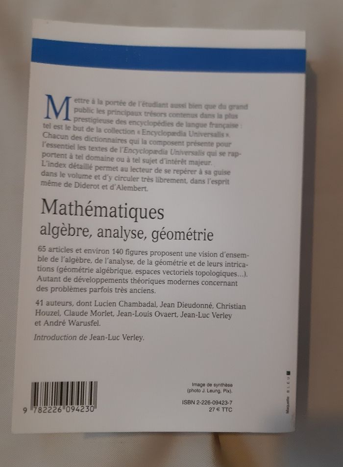 Dictionnaire des Mathématiques Encyclopedia Universalis Algèbre, Analyse, Géométrie 924 pages, 65 articles, 140 figures Niveau prépa Maths Physique Un panorama de l’algèbre, de l’analyse, de la géométrie et de leurs intrications : géométrie algébrique, espaces vectoriels topologiques… Format 15x22cm, poids : 994 g. En très bon état. 📦 Envoi possible. 🛍 Remise en main propre possible dans le secteur de Pont-Audemer, Beuzeville, Epaignes Pont-L'évêque. 🏷 jusqu'à 15 % de réduction pour l'achat de plusieurs articles