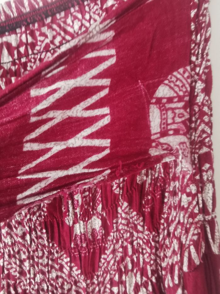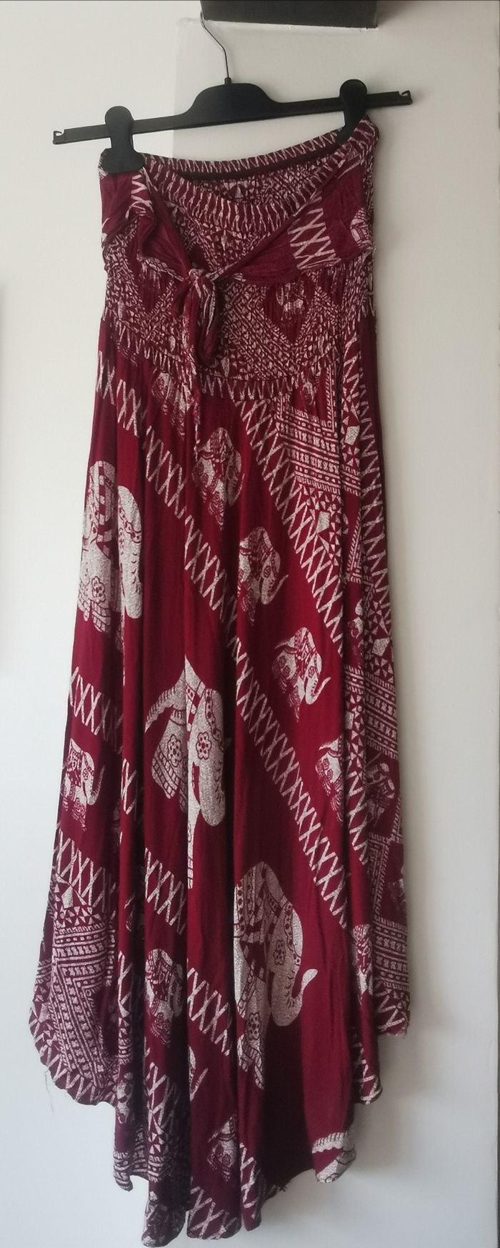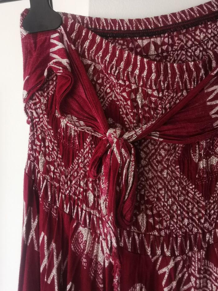 Jupe longue asymétrique. Noeud à nouer à la ceinture. Présente défaut d'usure à la ceinture (voir photo)