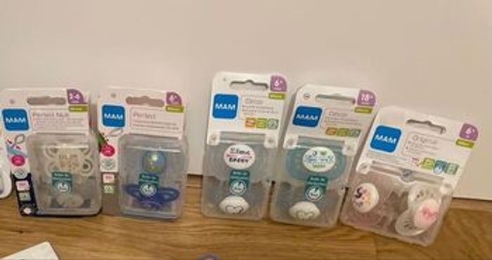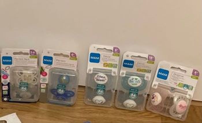 Sucettes MAM mixes: Une boîte (2-6 mois ) 3 boîtes (6+) Une boîte (18+) SUCETTES ANATOMIQUES EN SILICONE Avec boîte de stérilisation Sans BPA Neuves jamais ouverts 4€ - la boîte de deux sucettes ! N’hésitez pas à me contacter si vous souhaitez prendre plusieurs je vous ferai un prix !
