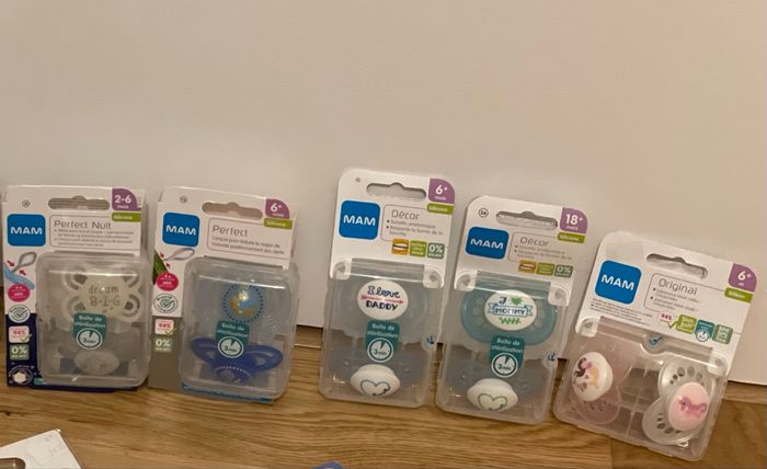 Sucettes MAM mixes: 2-6 mois ( une boîte) 6+ (3 boîtes) 18+ (une boîte) SUCETTES ANATOMIQUES EN SILICONE Sans BPA Neufs jamais ouverts 4€ - la boite de deux sucettes ! N’hésitez pas à me contacter si vous souhaitez prendre plusieurs je vous ferait un prix !