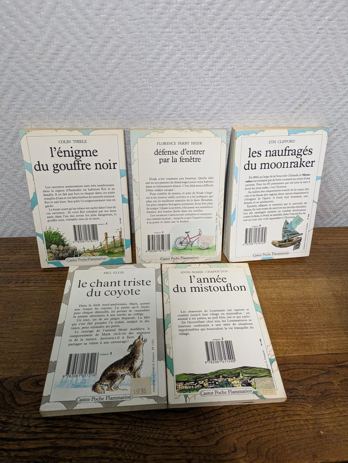 Lot de 5 livres édition castor poche L'année du mistouflon catégorie 2 Le chant du coyote catégorie 3 L'énigme du gouffre noir catégorie 4 Défense d'entrer par la fenêtre catégorie 4 Les naufragés du moonraker catégorie 6 Les livres datent des années 80 Des petites tâches jaunies Beaucoup d'autres livres dans le dressing