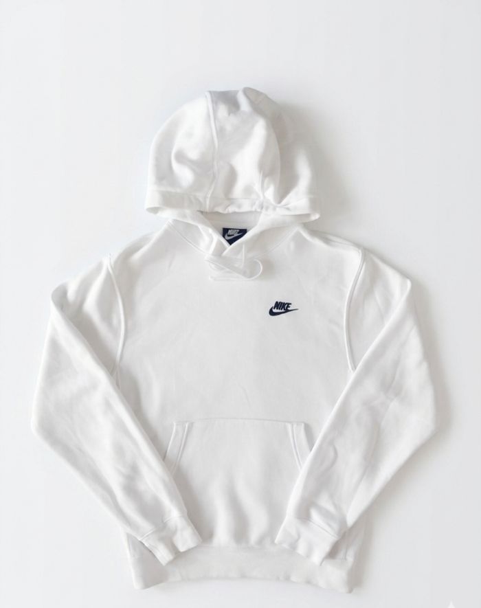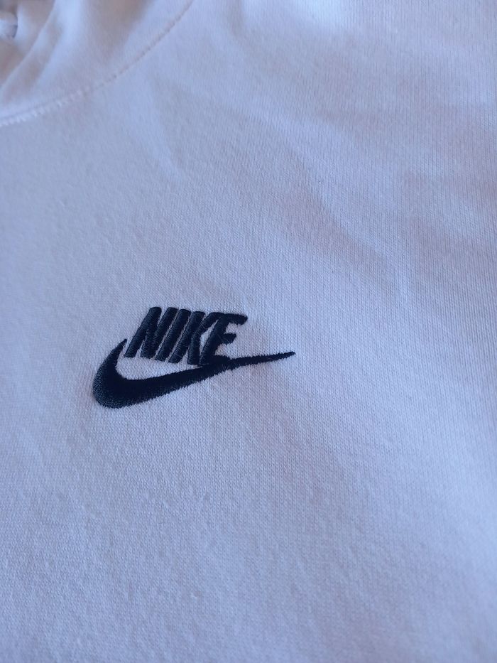 Sweat-shirt Nike blanc immaculé, à capuche ajustable et poche kangourou. Design minimaliste avec logo Nike brodé en noir : un style classique et polyvalent.