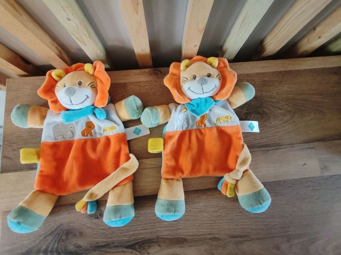 Tex collection Jungle doudou plat lion orange jaune bleu vert éléphant Tbe Étiquette marque présente sur les 2 Le lot 15. 90 euros Envoi en relais