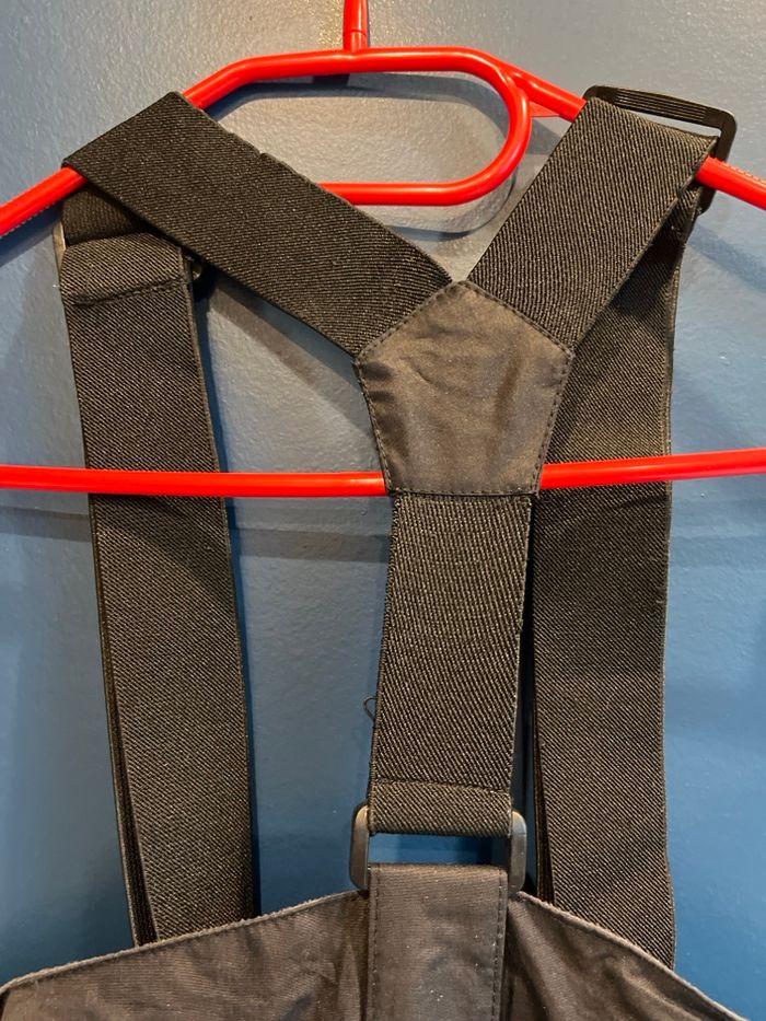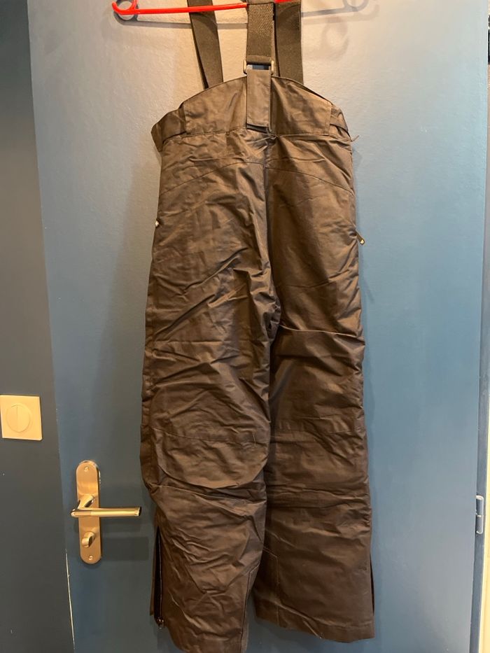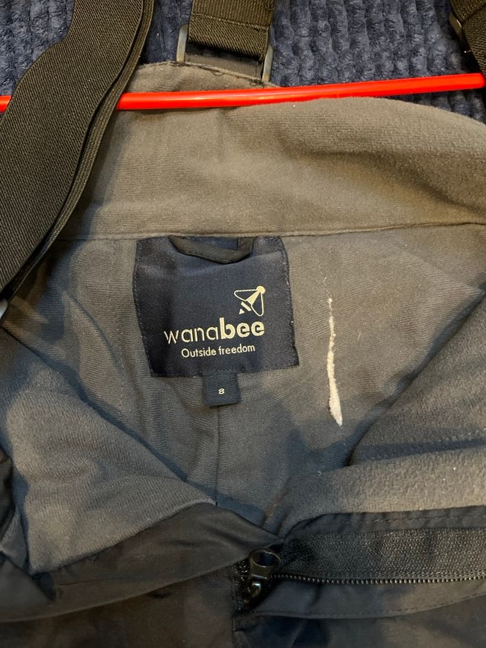 Salopette de ski - WANABEE - 8 ans En bon état Couleur noire 2 poches zippées Réglable à la taille et aux épaules Les bretelles sont légèrement distendues mais se règlent très bien. De même on voit un peu de mousse sur la couture intérieure mais c’est d’origine, pas de déchirures