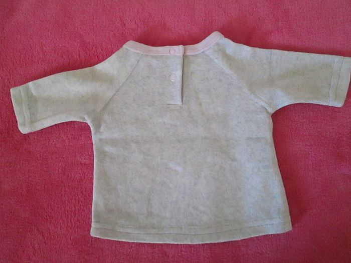 Vends sweat Boîte à Malices gris & rose. S'attache par des pressions en haut du dos. Taille 1 mois. Excellent état. Pour plus de choix, allez consulter mes autres annonces.