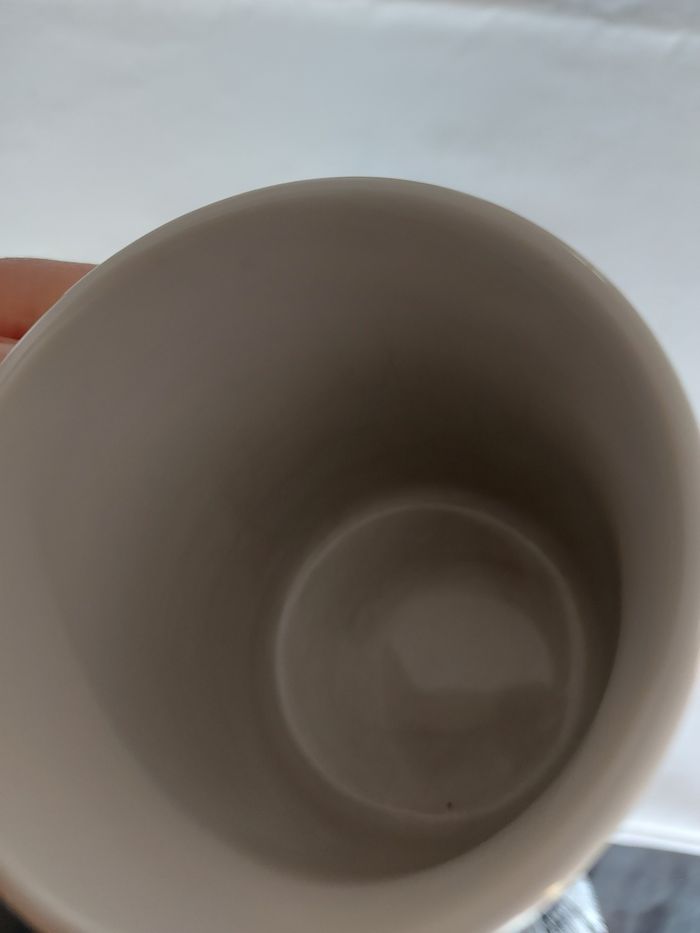 Mug blanc, aspect neuf extérieur, griffes à cause de la cuillère à l'intérieur Ht 9,5 x diamètre 7,5 cm B état