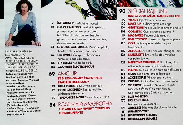 184 pages 28x22cm spécial brad et angelina 2 pages, couture 2010 2 pages, nathalie dessay 2 pages, julia roberts 4 pages, rosemary 6 pages, rajeunir 46 pages, mode must 8 pages, mode sacs 8 pages, cuisine rapide 5 pages..