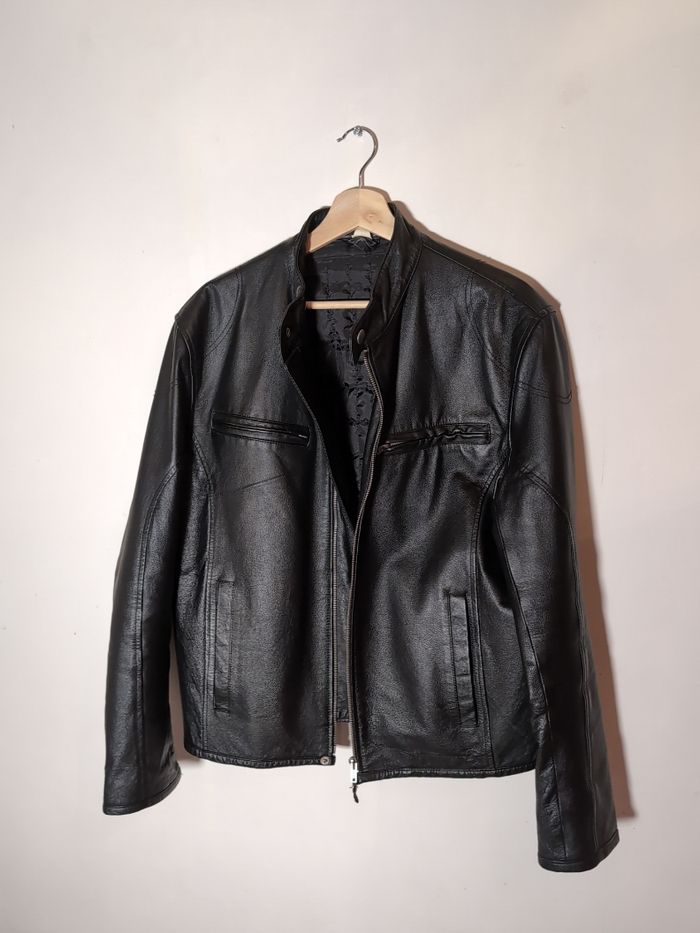 ENGLISH BELOW Veste en cuir vintage, taille L 41-42 toutes les fermetures éclairs fonctionnent, pas de tâche, pas de trou, pas de déchirure, poche en état parfait, doublure en état parfait, deux poches à l'intérieu. Pas de marque visible, l'étiquette s'est effacé Largeur de la veste sur les épaules 53 cm Largeur sur la poitrine 52 cm Largeur de la veste en bas 55 cm Longueur bras extérieur 64 cm Longueur bras intérieur 47 cm ENGLISH French Vintage Leather Jacket size european 41-42 L. no holes, no discoloration, zippers fonctioning, inside in perfect condition, two pockets inside. No visible brand. Shoulders 53 cm Chest 52 cm Width lower part of jacket 55 cm Length arm exterior 64 cm Length arm interior 47 cm