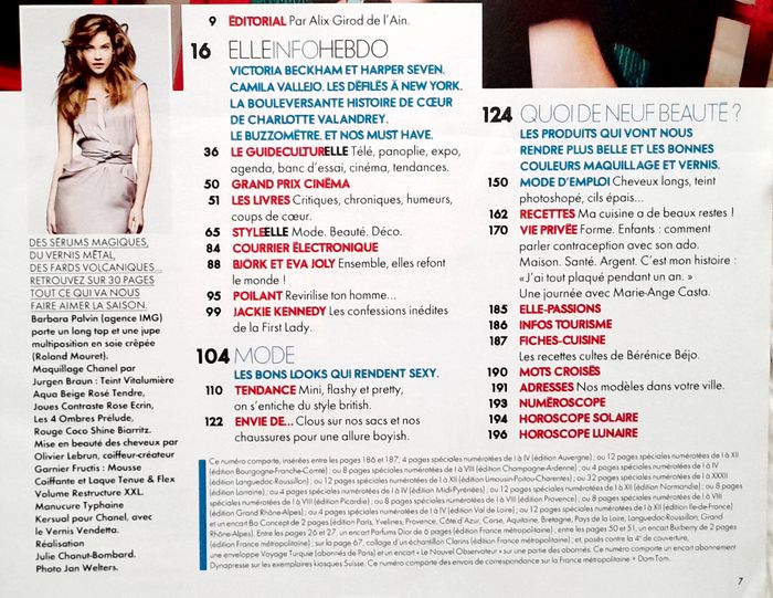 186 pages 28x22cm spécial beckham 2 pages, défilés new york printemps été 2012 3 pages, charlotte valandrey 2 pages, mitterand 2 pages, ashley smith 1 page, bjork et eva joly 3 pages, jackie kennedy 2 pages, mode sixties 12 pages, beauté 30 pages avec barbara calvin, cuisine 5 pages, marie ange casta 1 page, camille goutal 2 pages..