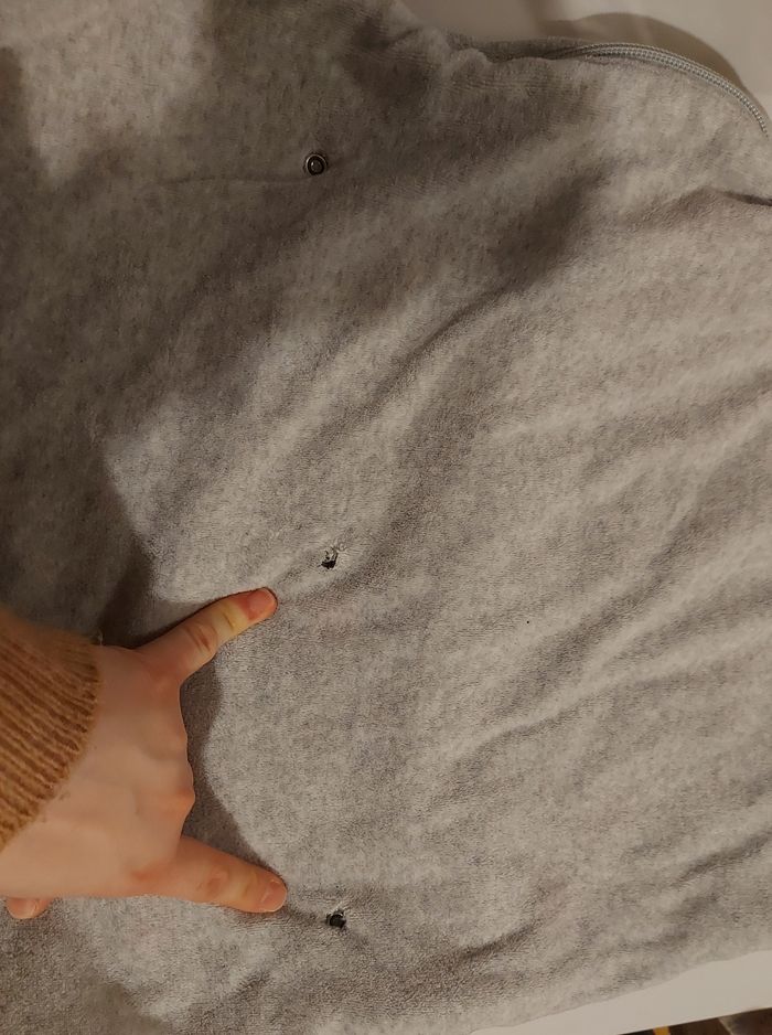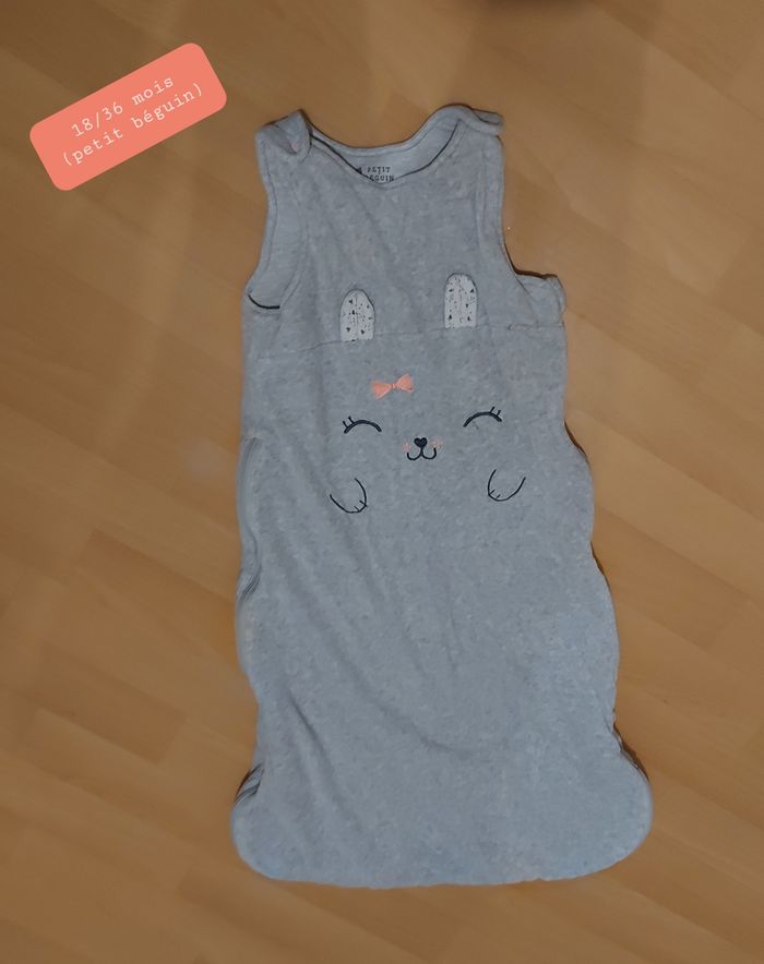 Gigoteuse de la marque petit béguin, 18/36 mois. Bien épaisse. Juste les deux pressions de derrière usées. Voir photo , mais ne gêne en rien à l'utilisation.