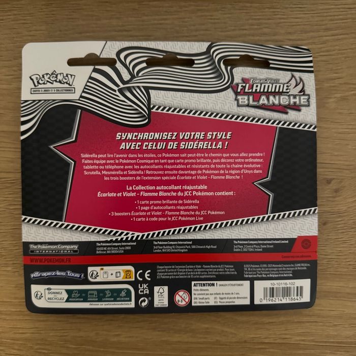 Vend tripack pokémon de la série flamme blanche ev10,5 Composée de 3 booster de la série et une superbe carte Siderella 3 exemplaires disponibles Neufs et totalement scellés