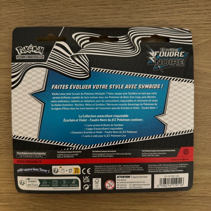 Vend tripack pokémon de la série foudre noir ev10,5 Composée de 3 booster de la série et une superbe carte Symbios 4 exemplaires disponibles Neufs et totalement scelle