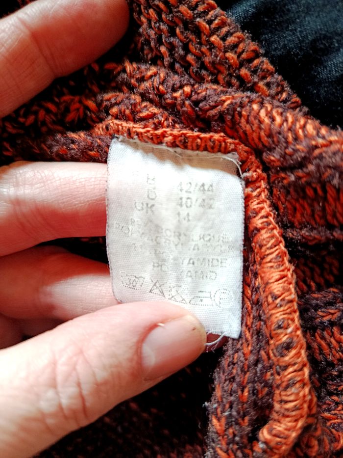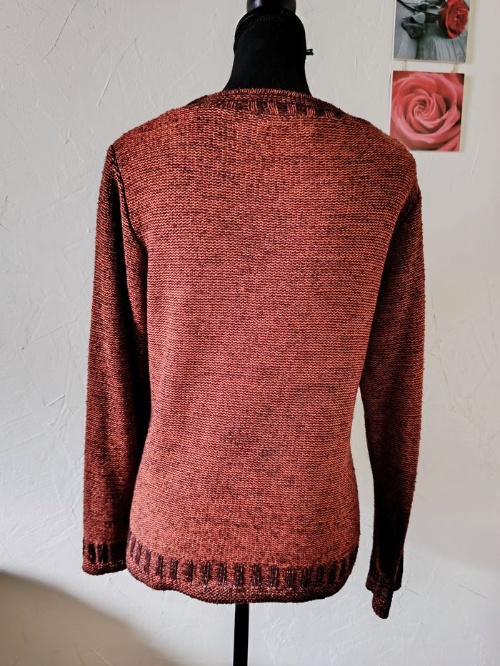 Joli pull marron et orange. Etiquette pas très lisible pour la composition (80% acrylique, 20% polyamide il me semble) Très bon état général. Largeur à plat d'une aisselle à l'autre : 48cm, longueur depuis le dessus de l'épaule : 59cm environ. #frip_femme42 #frip_femme44