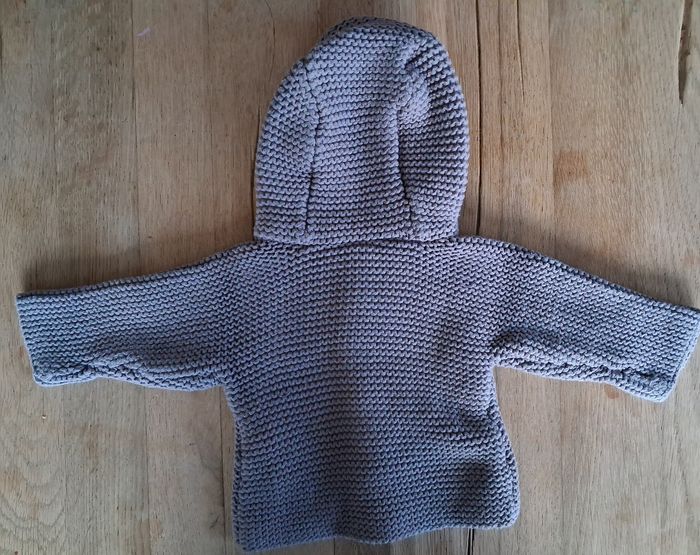 Gilet veste chaude Orchestra baby 1 mois Crochet epais gris taupe Boutonné Doublure intérieure coton motifs étoiles grises sur fond blanc État comme neuf Remis en main propre sur Dax Envoi possible