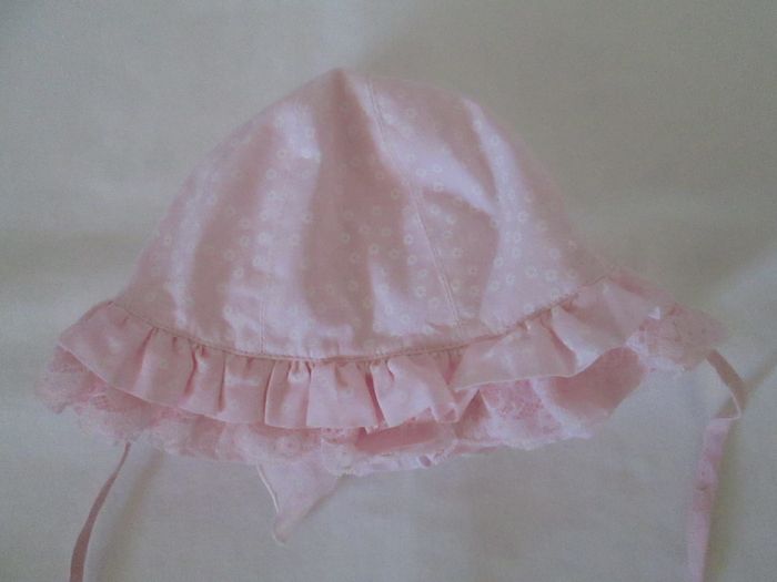 Vends chapeau bébé avec volants, dentelle et nœud derrière. Taille 1 mois mais semble plus grand. Neuf, jamais porté. Pour plus de choix, allez consulter mes autres annonces.
