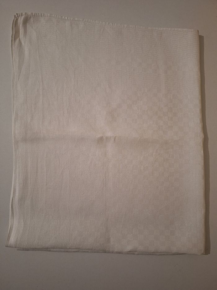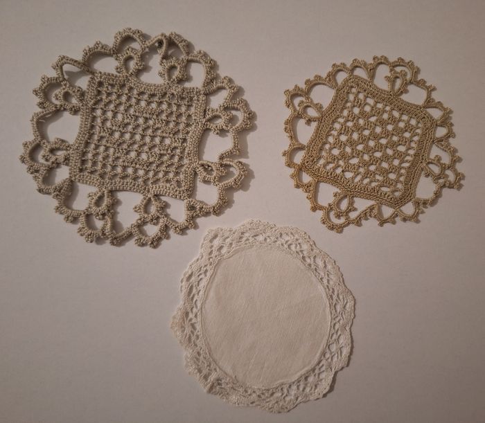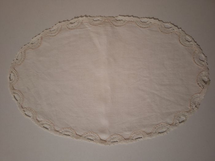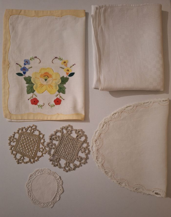 Un grand centre de table rectangulaire blanc de 90 cm x 75 cm, un rectangulaire fleuri de 45 cm x 30 cm, un ovale de 42 cl x 27 cm, trois petits ronds de 10/12 cm.
