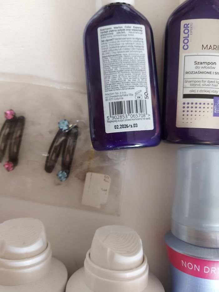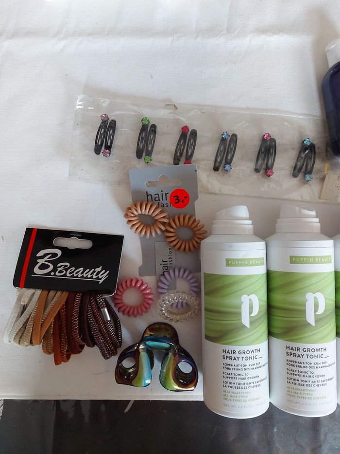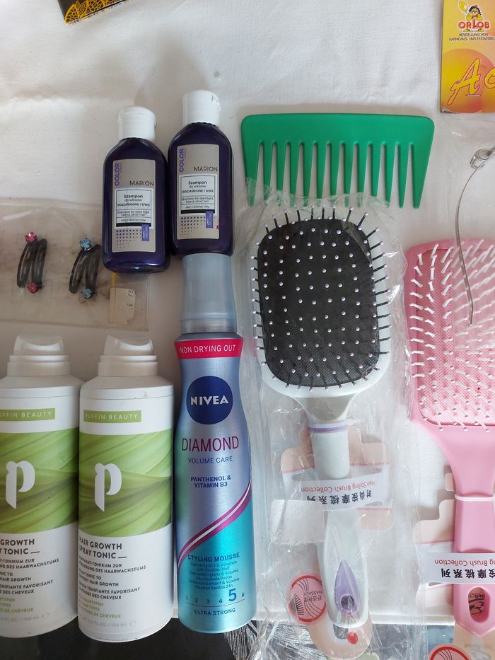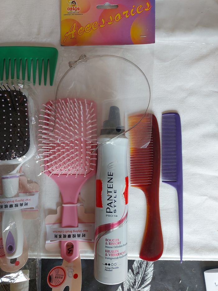 Lot 1 soins cheveux, comprenant : 2 brosses à cheveux 3 peignes 2 lots d'elastiques spirales 1 lot pinces strass 1 pince multicolore arc en ciel, griffée suite à l'entreposage 1 lot d'elastiques B beauty 1 Serre-tête nœud en métal 3 lotions toniques 150ml favorisant la pousse, sans capuchons mais neufs 1 mousse Pantène pour boucles 200ml 1 mousse styling Nivea 2 shampooings pour cheveux blonds 50 ml Le tout neuf, sauf indication détaillée
