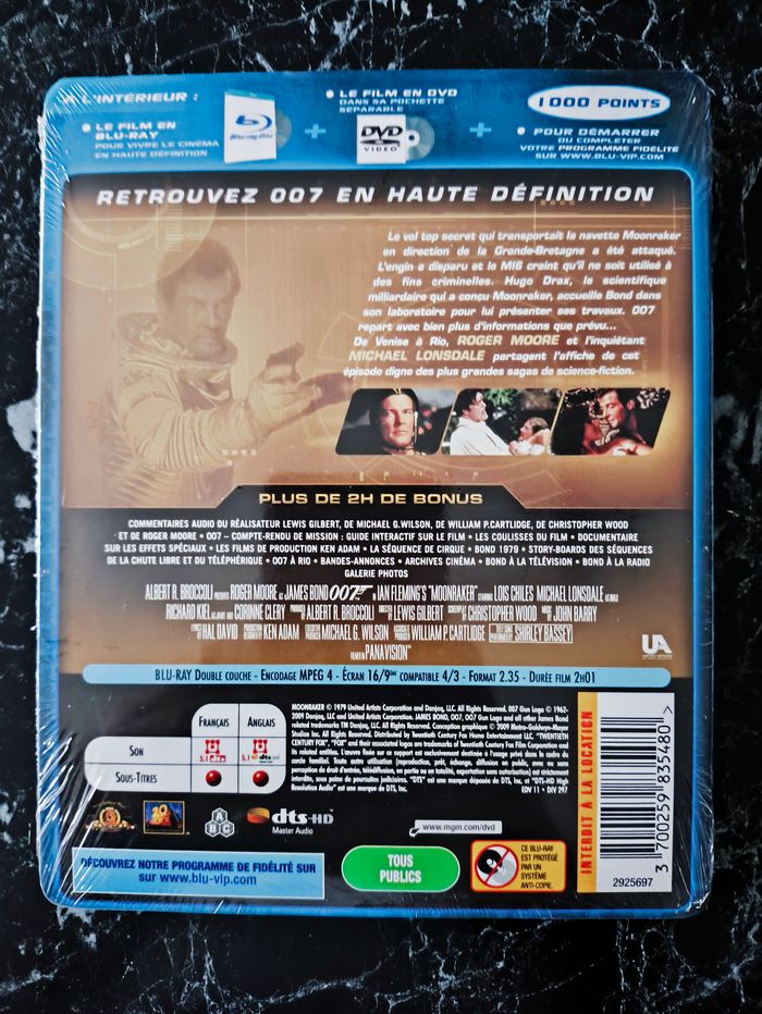 Film Moonraker (1979 - Moonraker) neuf encore sous blister. Action et Espionnage de Lewis Gilbert avec Roger Moore, Lois Chiles, Michael Lonsdale, Richard Kiel et Bernard Lee. Plusieurs autres films (DVD et blu-ray) et séries télé disponibles sur mon dressing. Si vous avez des questions ou souhaitez plus de photos, n'hésitez pas à me demander. Prix négociable seulement si vous achetez plusieurs articles. N'hésitez pas à créer un lot et à faire une proposition raisonnable et à me demander un prix. Tag de recherche : #neboo_video #neboo_bluray #neboo_film blu ray bluray langue français française French FR