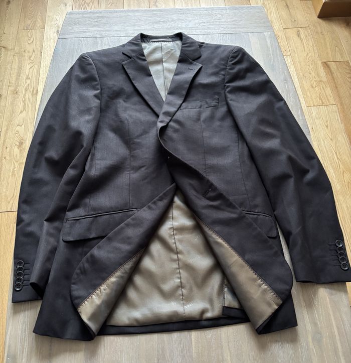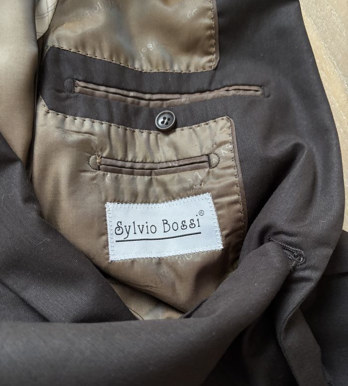 Veste de costume Sylvio Bossi, jamais portée. Entièrement doublée Coloris marron. Taille 48. Neuve sans étiquette. N'hésitez pas à me contacter pour plus d'informations.