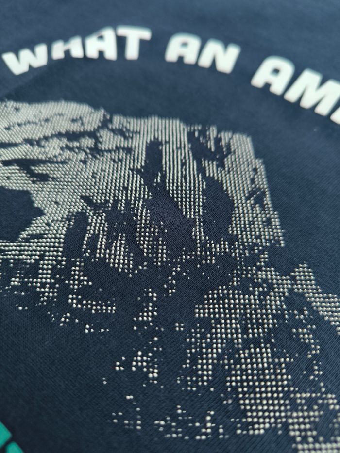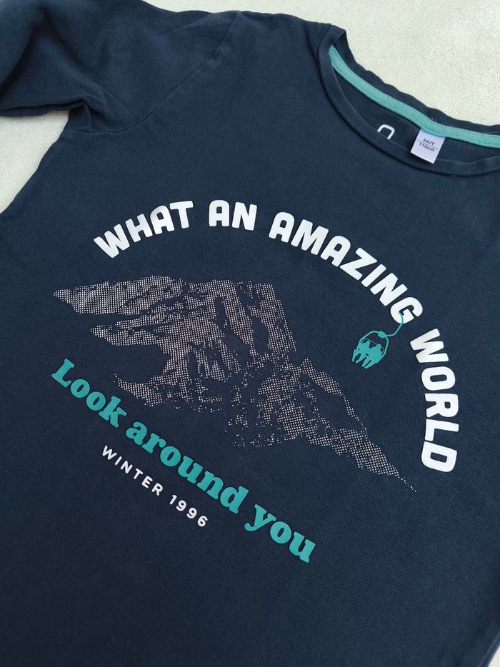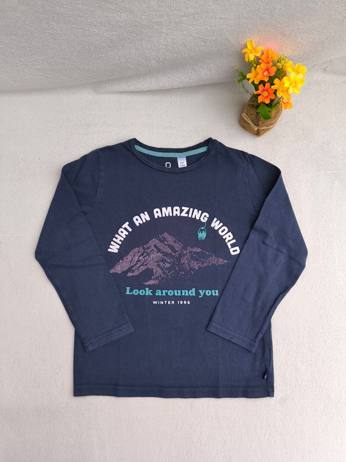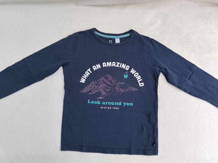 T-shirt à manches longues Marque Okaïdi Taille 6 ans, 116 cm • Coloris marine, blanc, turquoise • Inscription "What an amazing world look around you winter 1996", imprimés en texture montagnes • Coton fin • Une lettre décollée, quelques points manquants -> Les points sont blancs et non violet comme sur les premières photos En très bon état #evelyne_garcons_6ans #evelyne_garcons