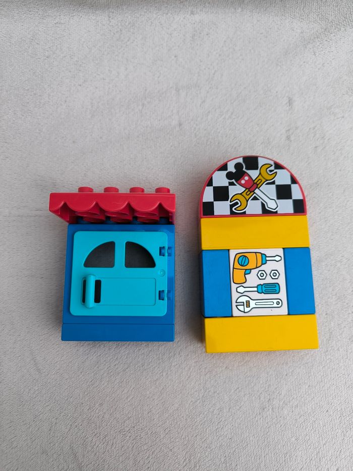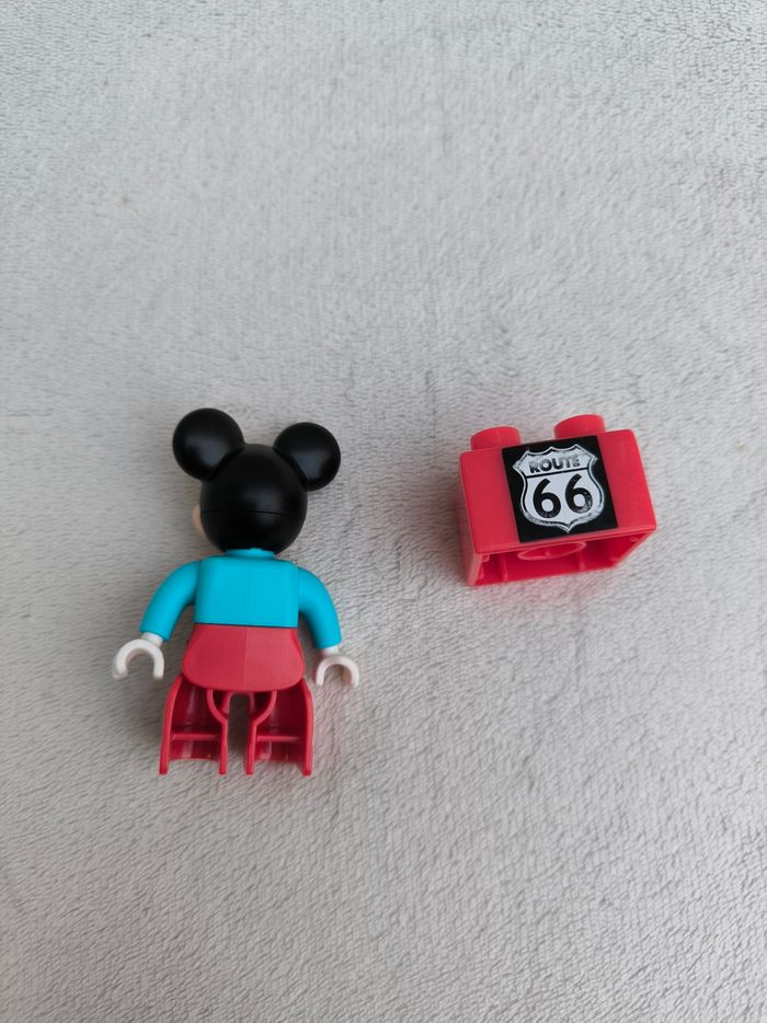 Lego Duplo 10829 : l'atelier de Mickey Marque Lego • L'atelier, porte amovible • Voiture avec Mickey • Manque une plaque grise, le plot de chantier, la clé à molette • Rajout d'une brique Méga Blocks, "Route 66" Sans boîte En très bon état #evelyne_jeux