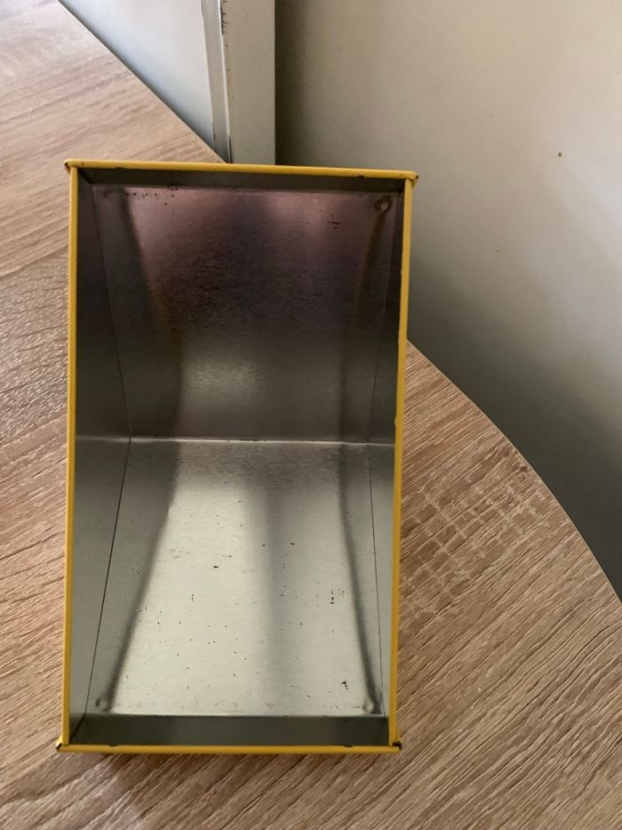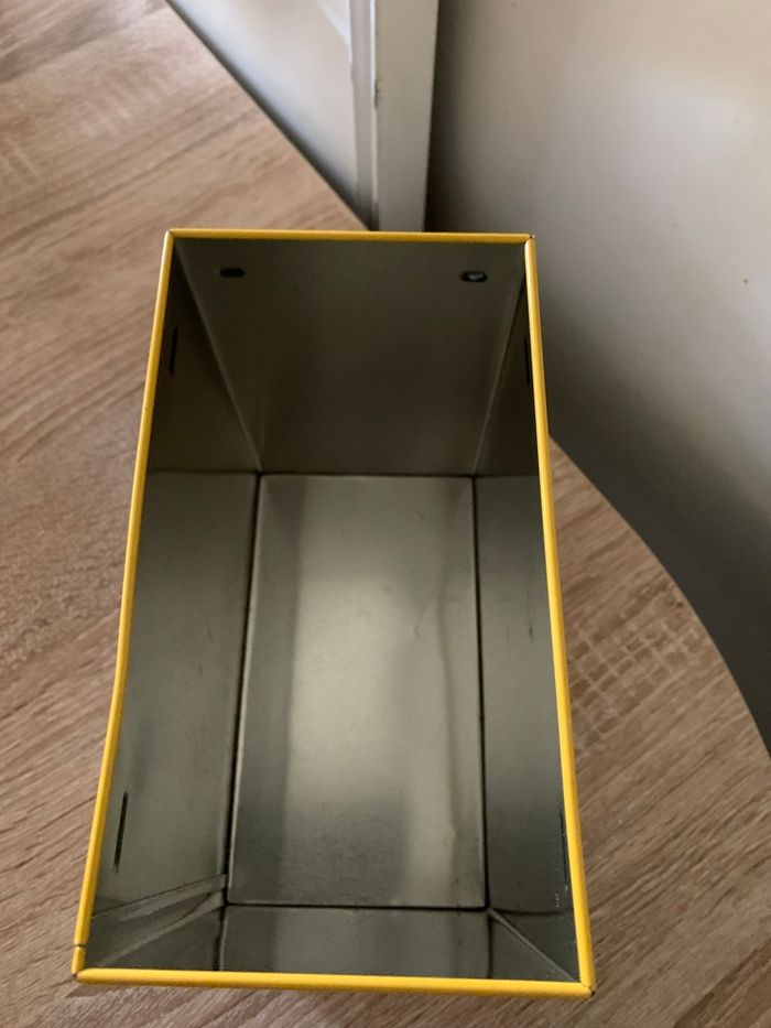En forme de maison Pour y ranger les friandises de chien Quelques marques à l’intérieur du couvercle ( voir photo) Mesure 20cm de haut jusqu’à la pointe du toit ( 14,5 cm sans la pointe ) Envoi rapide et soigné sous protection