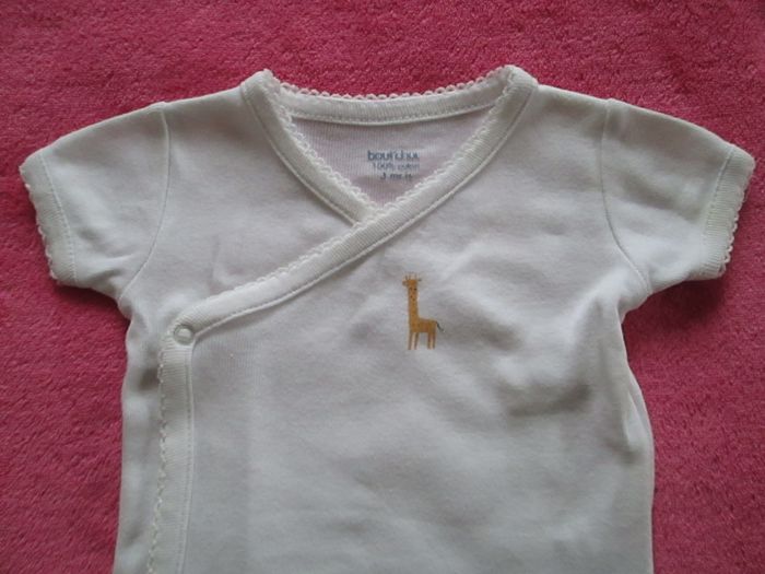Vends body blanc Bout'chou à manches courtes. Motif girafe. 100 % coton. Taille 3 mois. Très bon état. Pour plus de choix, allez consulter mes autres annonces.