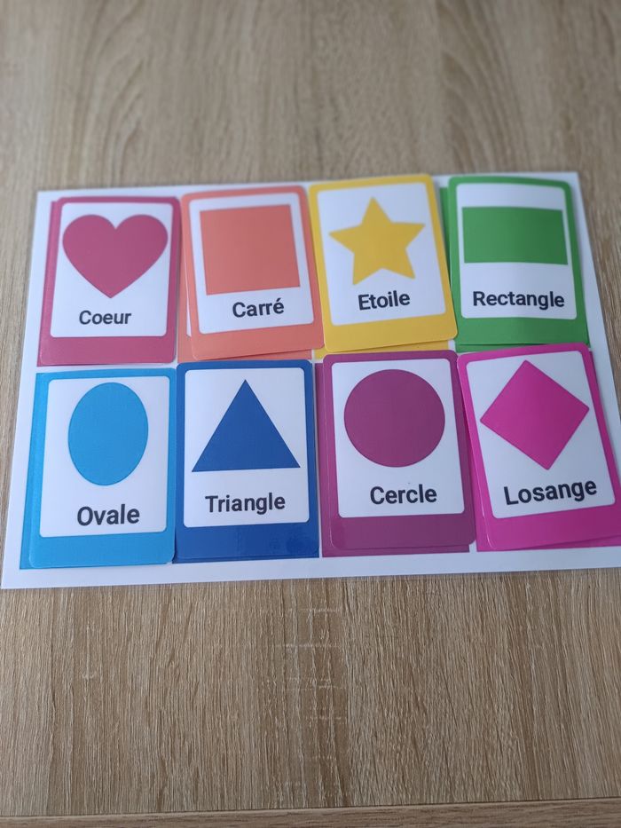 Jeu éducatif Montessori sur les formes géométriques. - Type de produit : Jouets d'éveil - Âge recommandé : De 0 à 3 ans et +. - Composition du lot : 8 cartes avec différentes formes géométriques (cœur, carré, étoile, rectangle, ovale, triangle, cercle, losange) - Fonctionnalités : Apprentissage des formes, des couleurs et de la reconnaissance des symboles - Confectionner à la commande. - Pochette refermable fourni. Un excellent outil d'apprentissage pour les petits . D'autres activités sur mon profil.