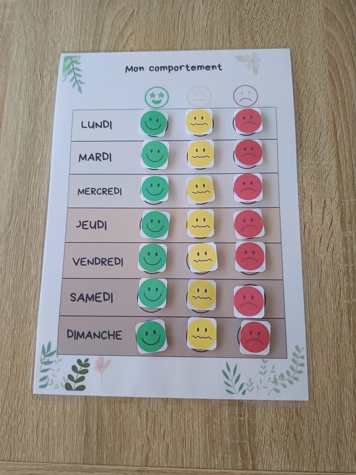 Fiche éducatif Montessori pour aider les enfants à apprendre à gérer leur comportement. C'est un outil très utile pour les parents et les enseignants. Ce jeu comprend une fiche avec des cases pour chaque jour de la semaine, ainsi que des éléments amovibles représentant différentes expressions faciales (sourire, neutre, triste). Les enfants peuvent placer les éléments dans les cases pour indiquer leur comportement de la journée. N'hésitez pas à proposer une petite récompense à la fin de la semaine. ( Une activité, une sortie, un temps écran, ou un plat préféré, un gâteau préféré... ) - Confectionner à la commande. - Pochette refermable fourni. D'autres activités sur mon profil.