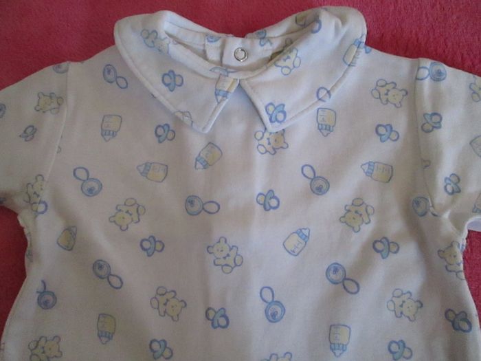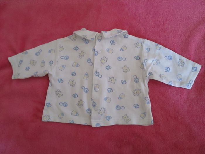 Vends brassière blanche à motifs tétines, hochets, biberons et nounours. Boutons-pression dans le dos. 100 % coton. Taille 3 mois. Excellent état. Pour plus de choix, allez consulter mes autres annonces.