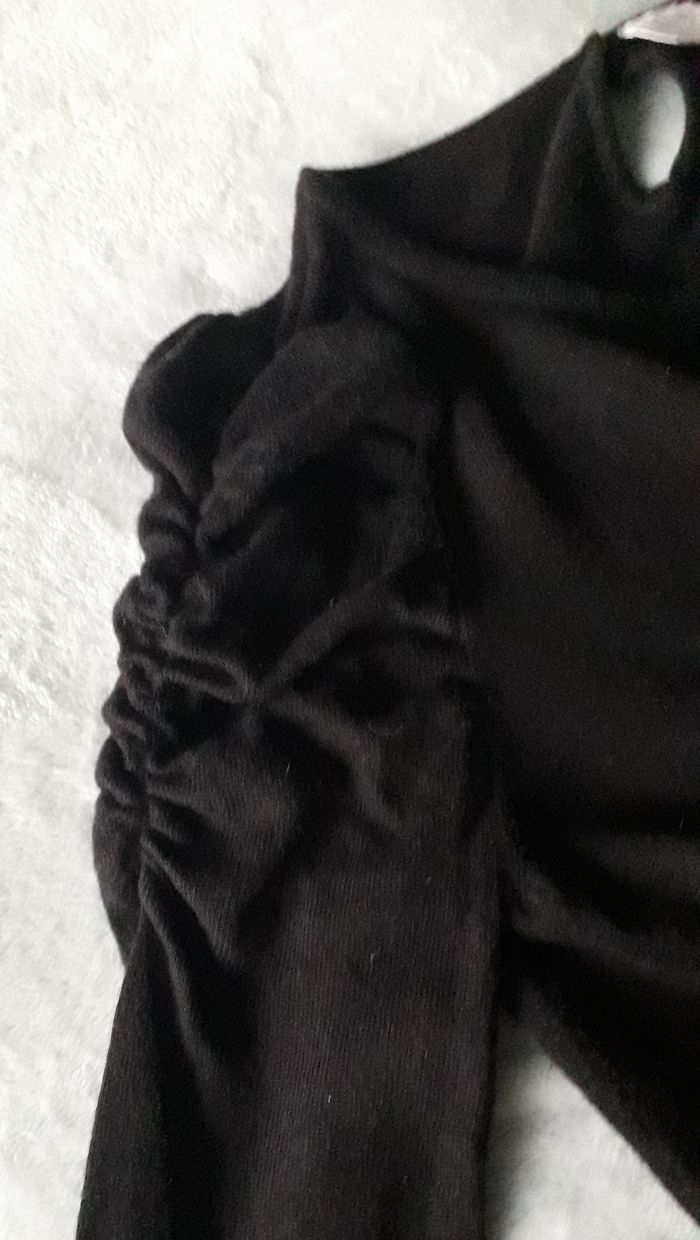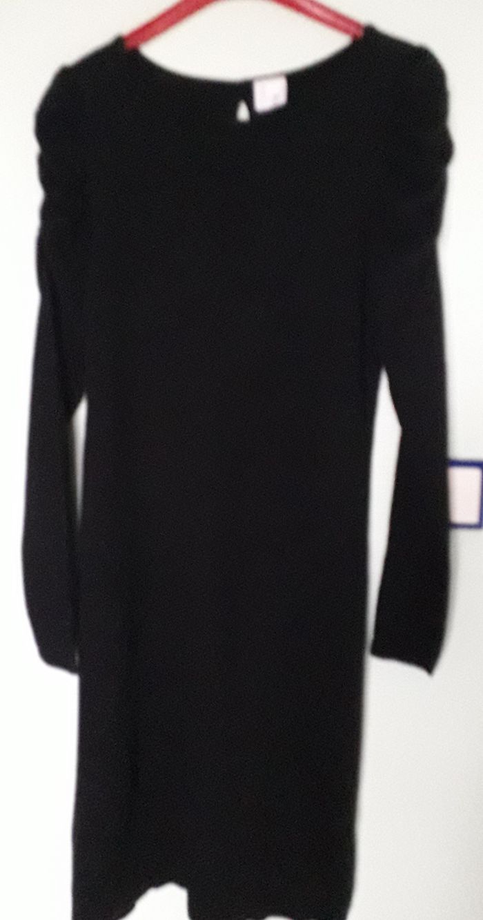 ROBE noire, taille 1 (36), marque CAMAIEU - Couleur : Noir - 40 % coton, 30 % viscose, 20 % polyamide et 10 % angora - Longueur totale : 101 cm - Jolis bouffants sur les manches - TBE