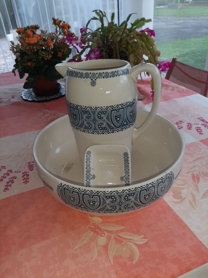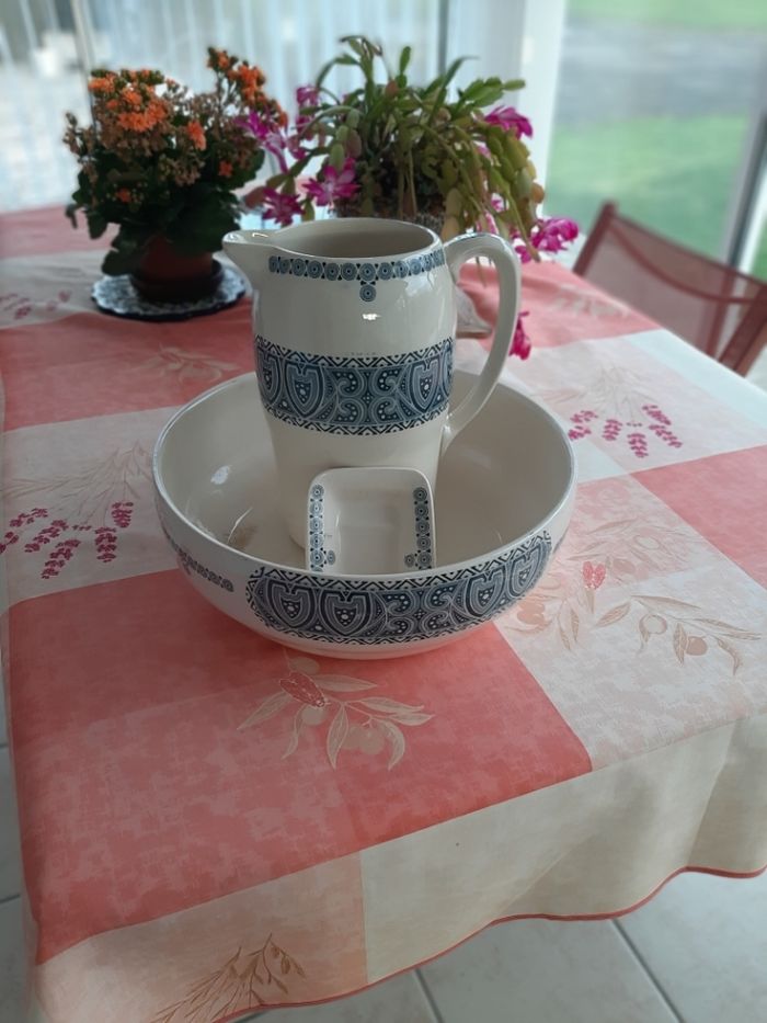 Broc de toilette hauteur 27 cm, diamètre 12 cm, cuvette de toilette hauteur 13 cm, diamètre 34 cm et dépose savon le tout en porcelaine.
