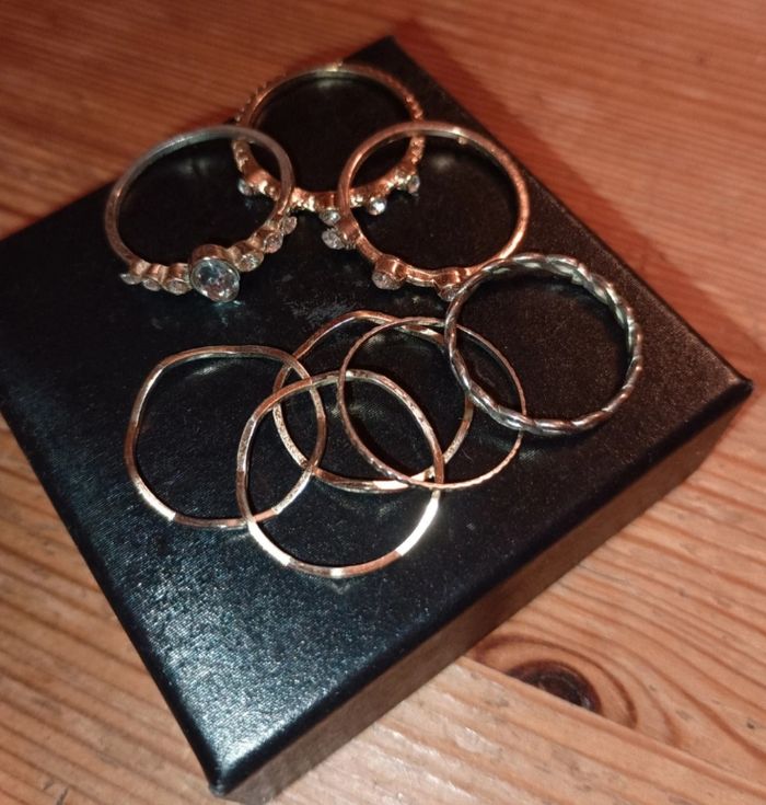 Je vends ce lot de 8 bagues fantaisie en acier (très légères). Prix pour le lot ou possibilité d'acheter à l'unité à 0,50€ chacune. La taille correspond à une taille 54 pour les bagues. - Type de produit : Bague - Univers : Femme - Matière : Acier - Nombre d'articles : 8 Très bon état. N'hésitez pas à me contacter pour plus d'informations ou de photos.