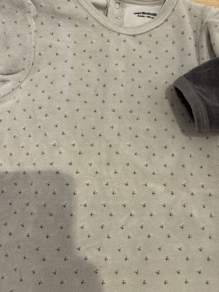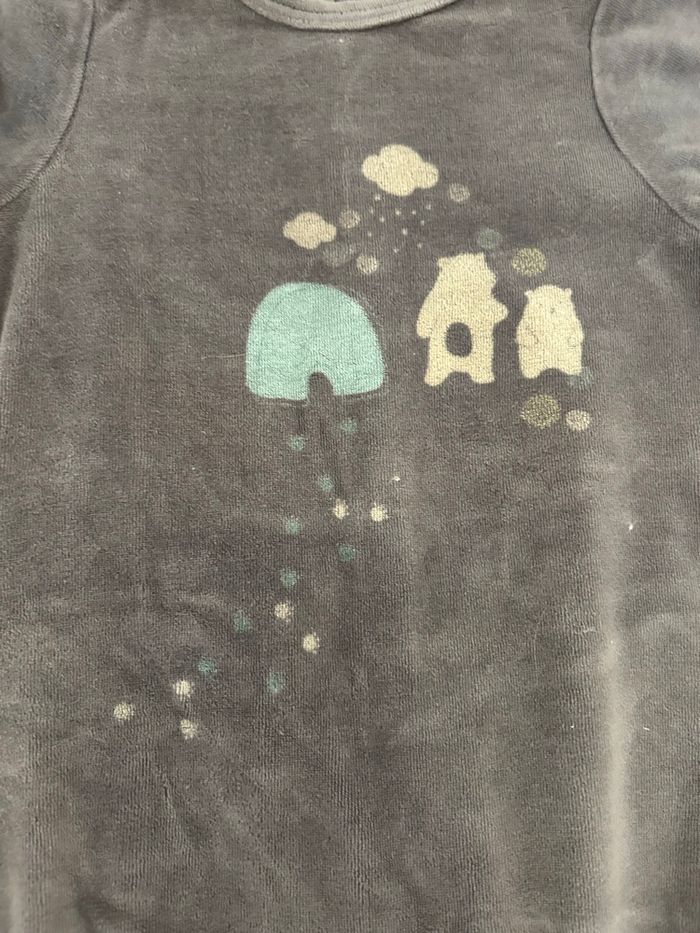 Pyjama une pièce Verbaudet en velours gris avec pieds intégrés, motif ours et igloo et petits points trop craquant 😍. Taille 36 mois / 94 cm , idéal pour les nuits d’automne/hiver, matière douce et confortable pour la peau sensible de bébé 🌙. Très bon état, porté quelques fois seulement, aucun trou ni tache, maison non-fumeur 🚭. Infos pratiques • Fermeture pressionnée dans le dos, facile à enfiler. • Pieds antidérapants super pratique • Lavé en machine, prêt à être porté. • Idéal pour la crèche, la maison ou chez les grands-parents. #verbaudet #PyjamaBébé #PyjamaVelours #36Mois #DorsBien #BébéGarçon #BébéFille #SecondeMain👶✨