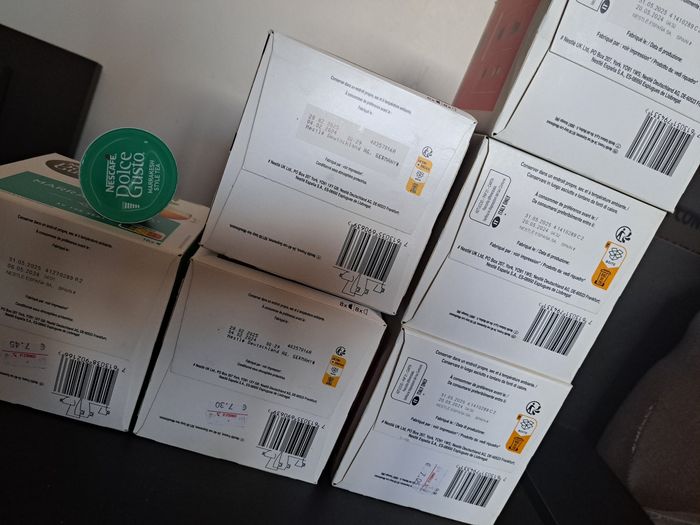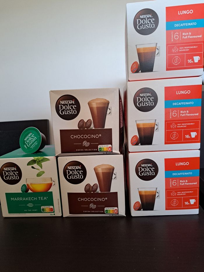 AFFAIRE A SAISIR 🤩🤩🤩 LOT ANTI GASPI 👍 Vends 6 paquets de capsules Nescafe Dolce Gusto - Neufs jamais ouverts - 1 paquet est un peu abîmé (Lungo). Il y a en tout et pour tout 97 dosettes 😊 ⚠️ DLUO dépassée 31.05.25 : Lungo et Marrakech Tea 28.02.25 : Chococino Prix du lot 30€