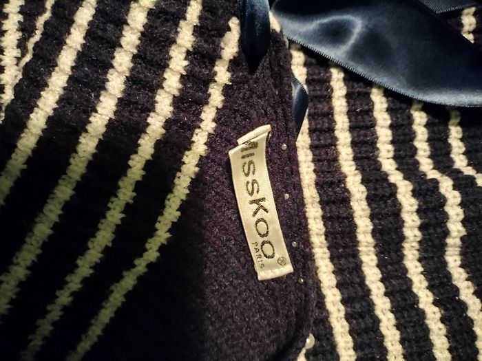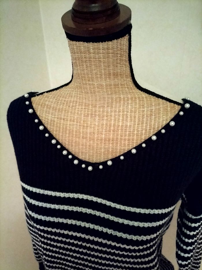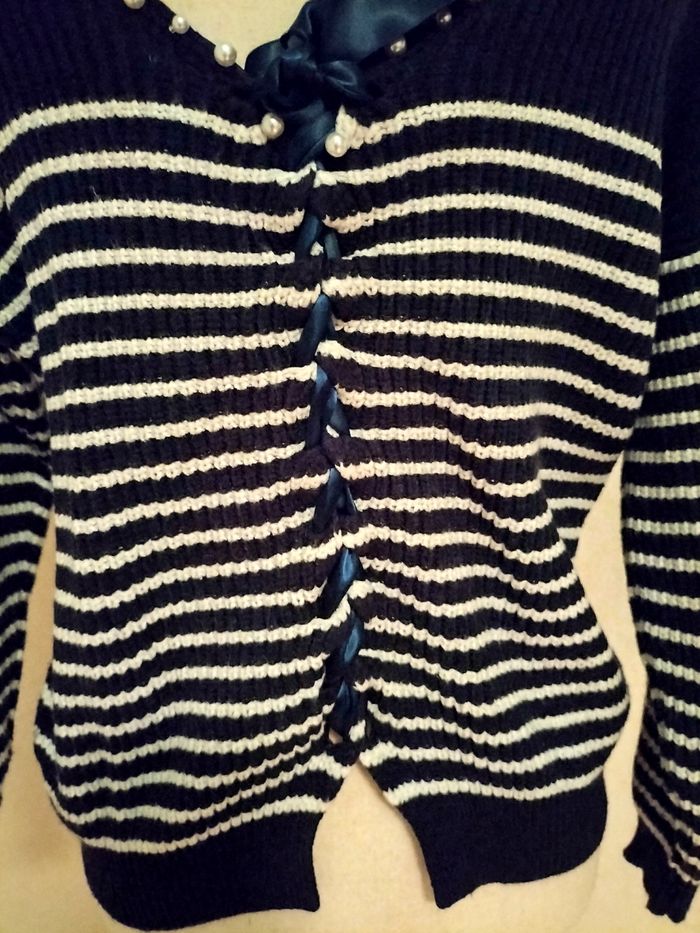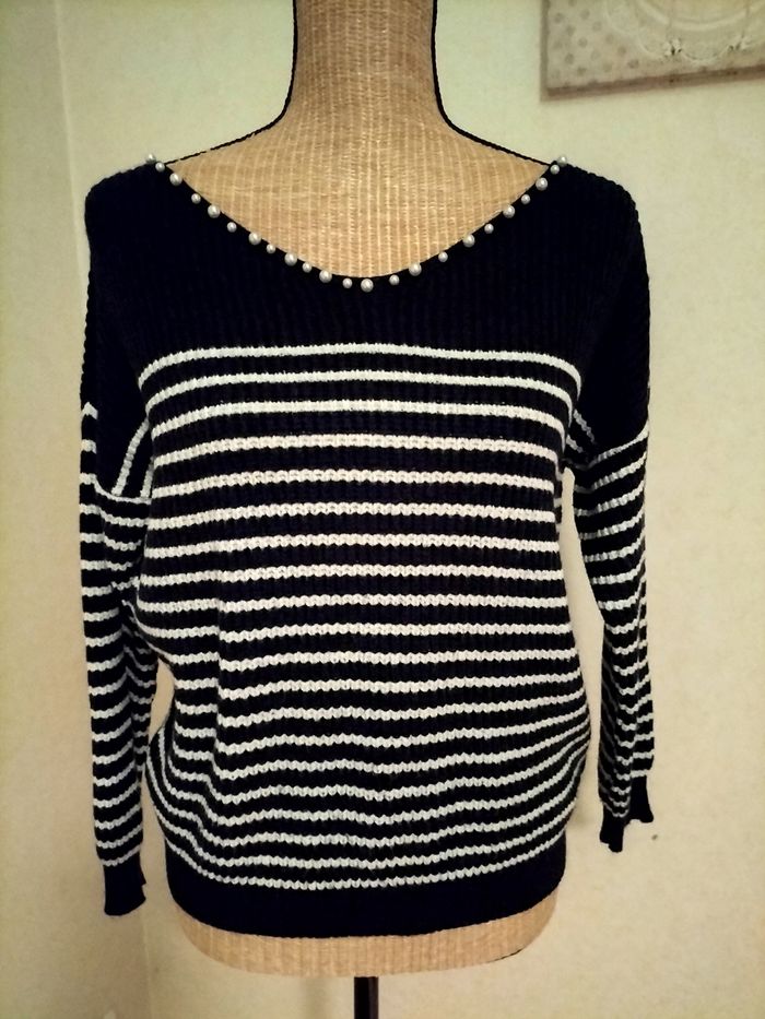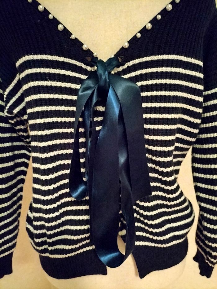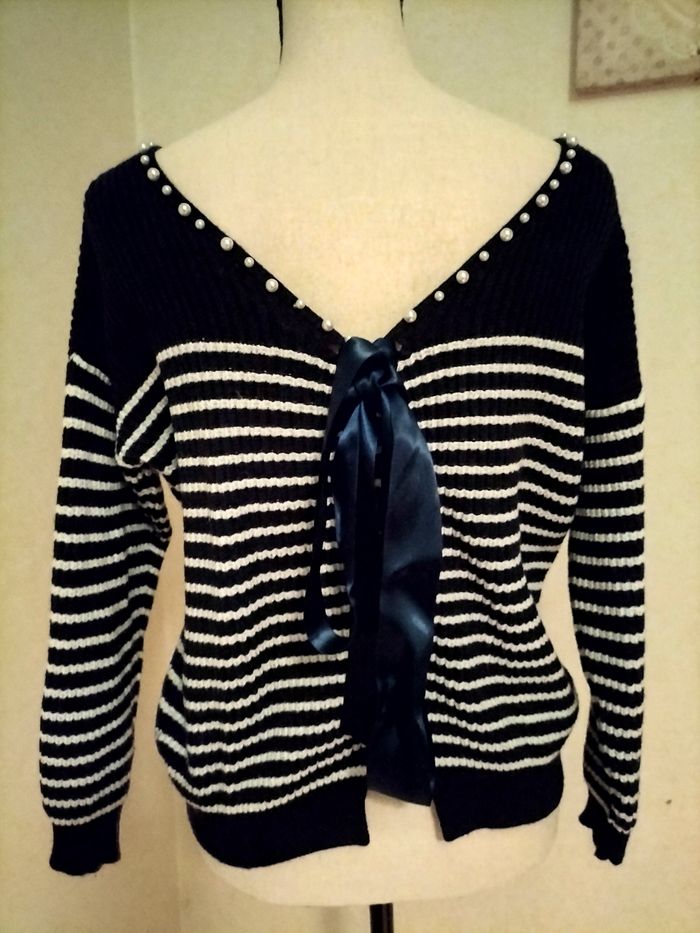 Pull marin. Col orné de perles. Joli noeud au dos