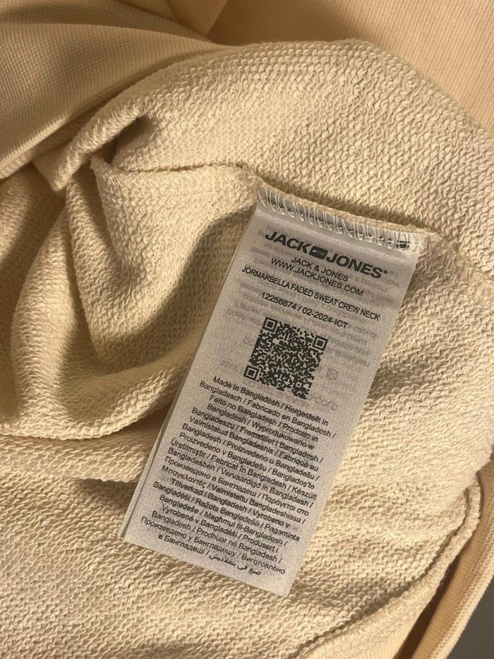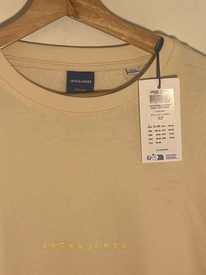 Sweat-shirt beige à col rond de la marque JACK & JONES Originals, modèle JORMARESLU PADDED. Logo jaune imprimé sur la poitrine, étiquette bleue intérieure confirmant l’authenticité. Coupe droite, matière douce et confortable. 📏 Taille : S (EU 2) 🆕 État : neuf avec étiquette – jamais porté. 🌍 Fabriqué au Pakistan dans le respect des personnes et de la planète. 💸 Prix d’origine : 42€