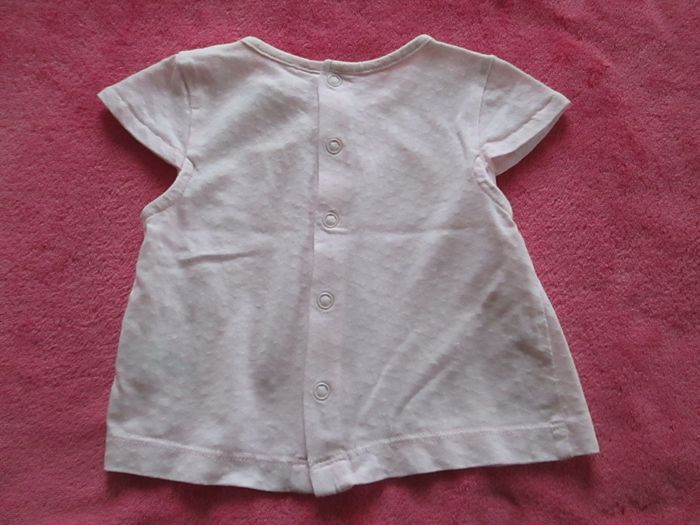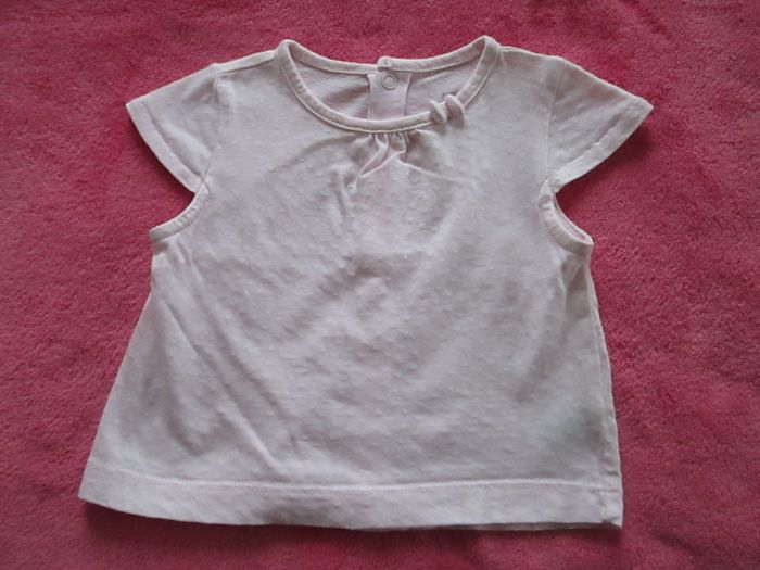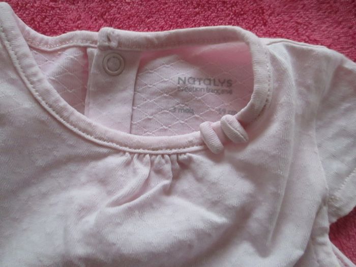 Vends blouse rose Natalys à manches courtes. Boutonnage derrière sur toute la longueur du dos. Petit nœud décoratif sur le col. 100 % coton. Taille 3 mois. Comme neuve. Pour plus de choix, allez consulter mes autres annonces.