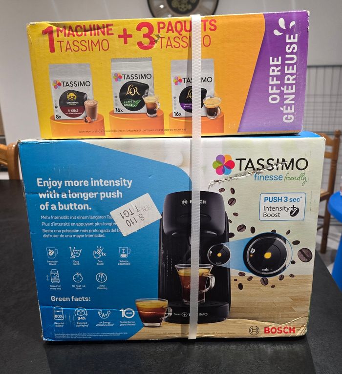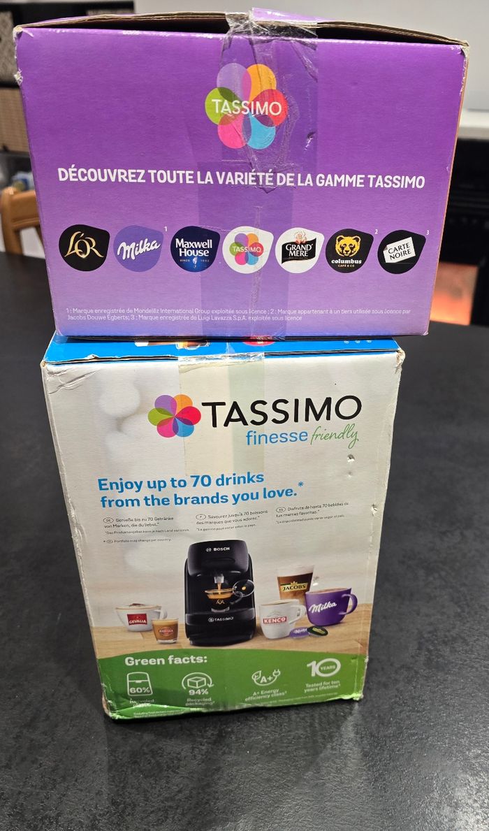 Tassimo finesse friendly neuve jamais déballer vendue avec 3 boîtes de dosettes La cafetière vaux 100e neuve seule et les dosettes entre 5 et un peut plus de 6 euros chacune des boîtes